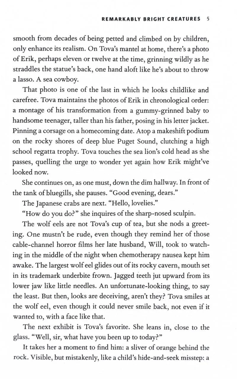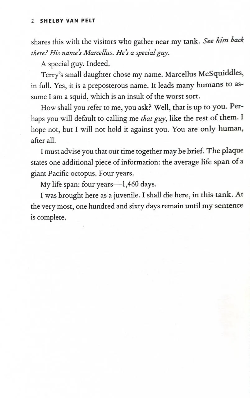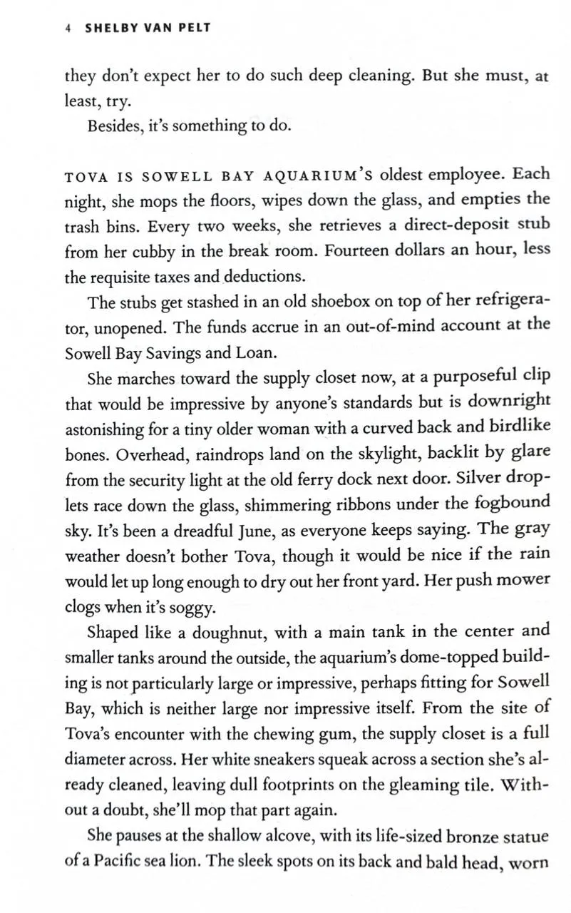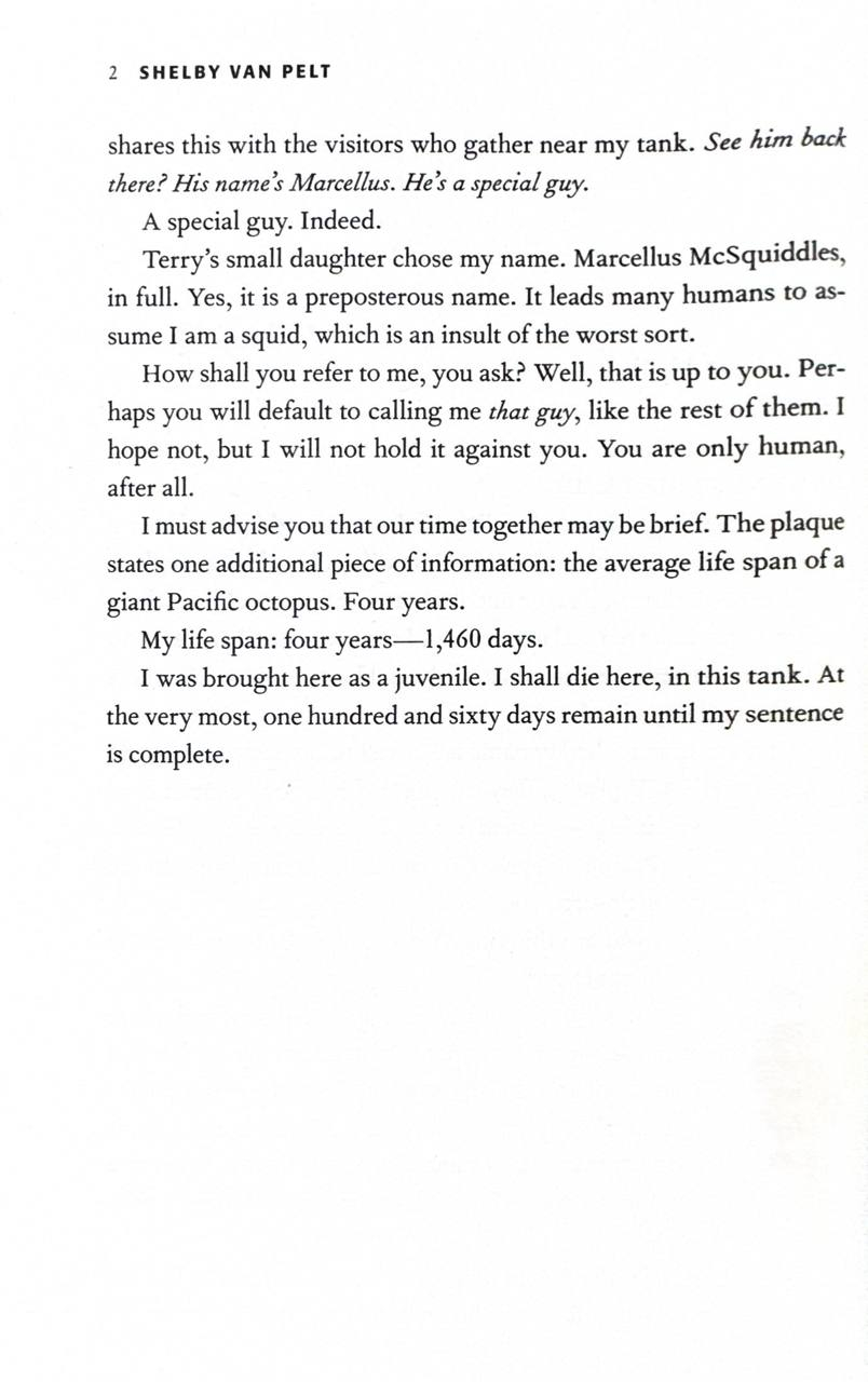 After Tova Sullivan's husband died, she began working the night cleaner shift at the Sowell Bay Aquarium. Ever since her eighteen-year-old son, Erik, mysteriously vanished on a boat over thirty years ago keeping busy has helped her cope. One night she meets Marcellus, a giant Pacific octopus living at the aquarium who sees everything, but wouldn't dream of lifting one of his eight arms for his human captors – until he forms a remarkable friendship with Tova.Ever the detective, Marcellus deduces what happened the night Tova's son disappeared. And now Marcellus must use every trick his old body can muster to unearth the truth for her before it's too late...Shelby Van Pelt's debut novel is a reminder that sometimes taking a hard look at the past can help uncover a future that once felt impossible.