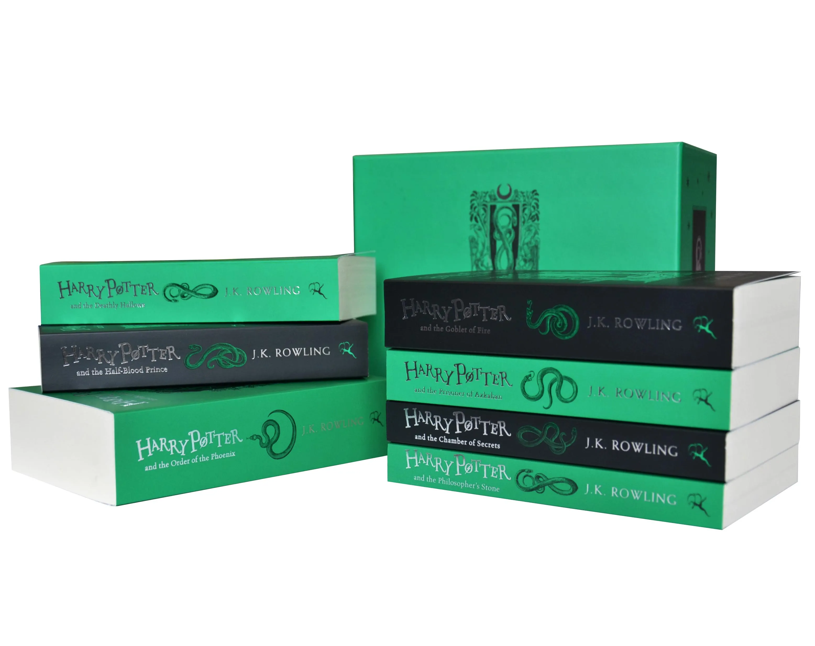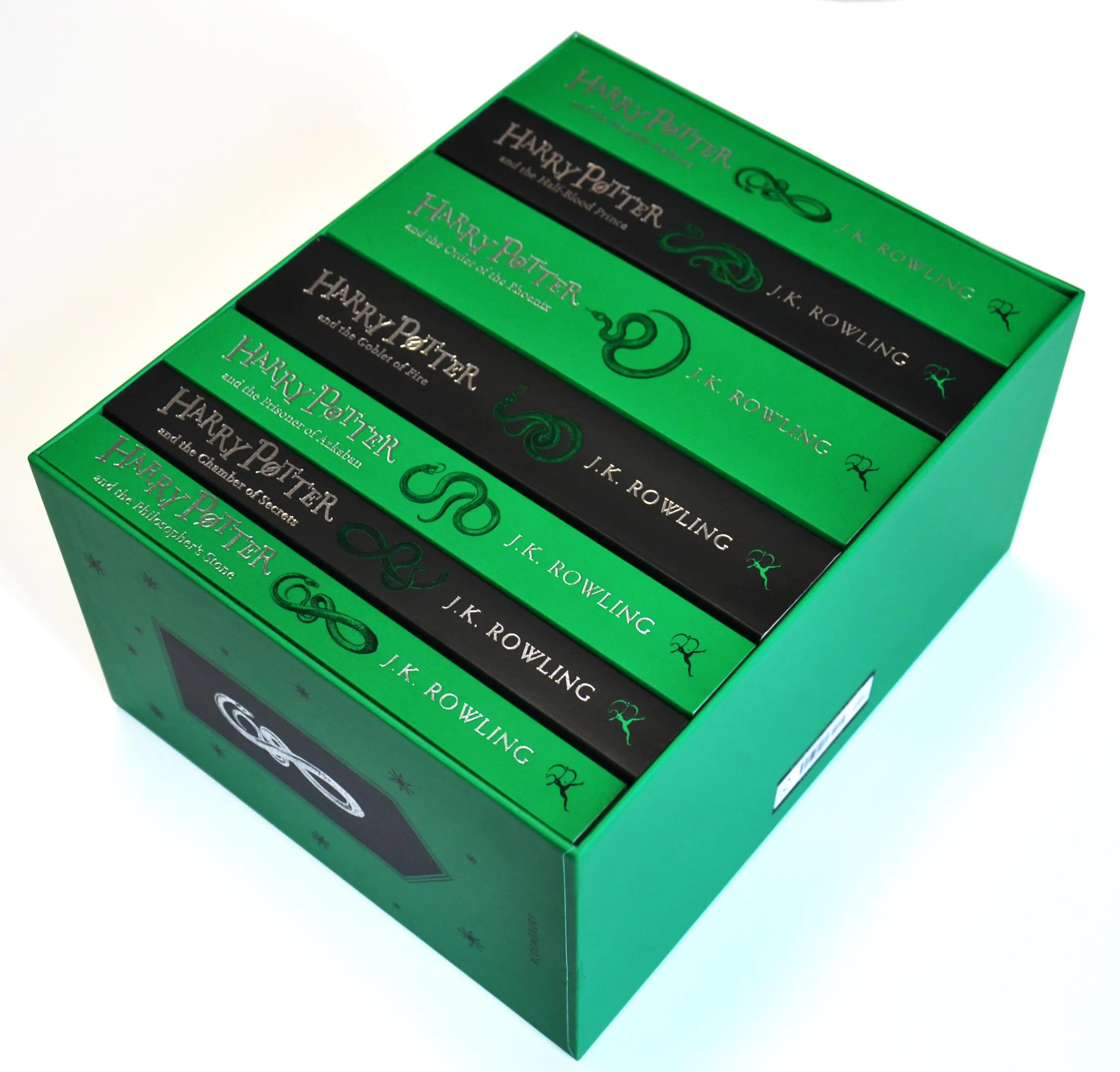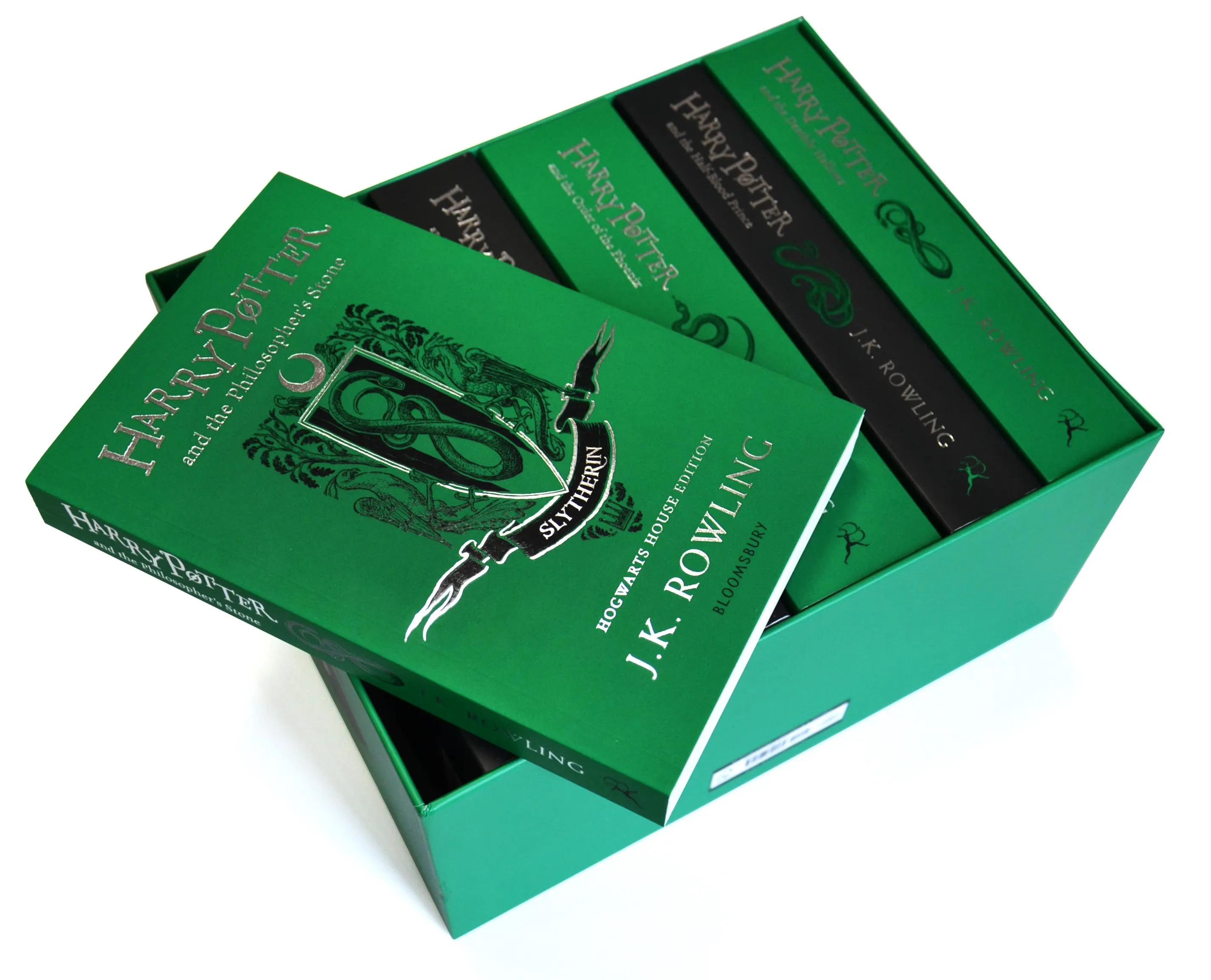 Дім амбітних і честолюбних, Слизерин виховав деяких із найвідоміших відьом і чаклунів в історії, серед яких Драко Мелфой та Лорд Волдеморт. Сім любовно створених обкладинок прикрашені чарівними деталями, що відображають улюблені слизеринські мотиви кожного роману. Милі віньєтки зі змією Слизерину в серії грайливих поз на корінцях книг завершують оформлення.