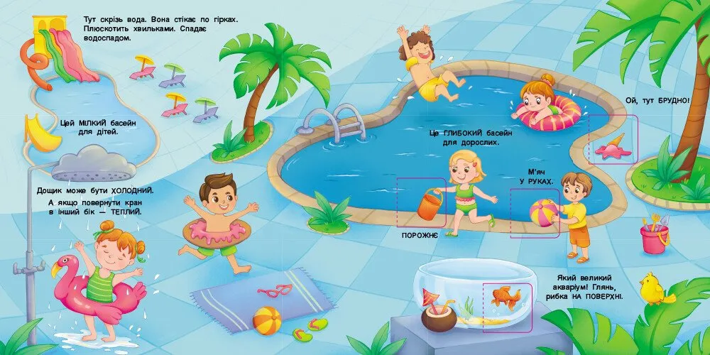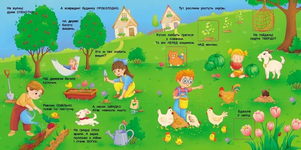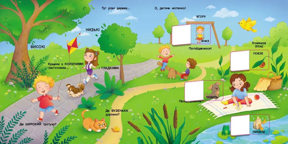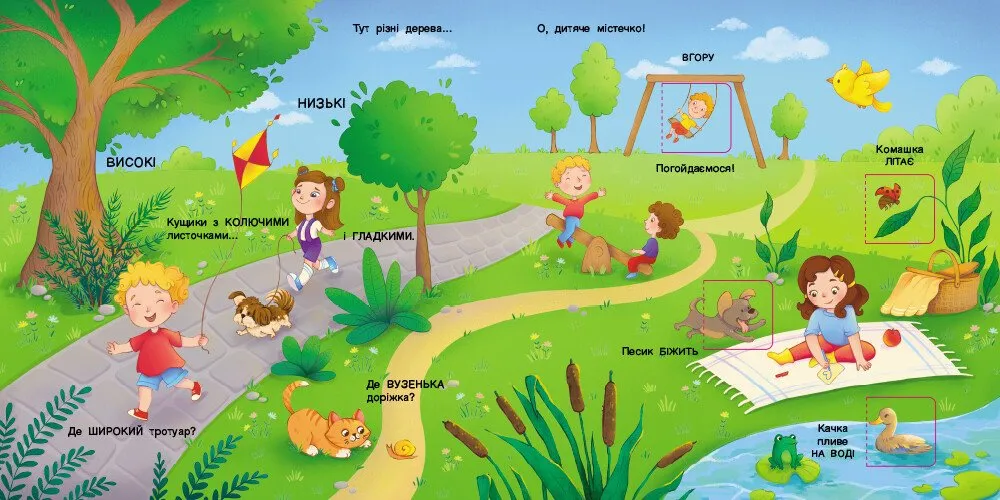 Книжка складається з коротких, доступних текстів і яскравих ілюстрацій, які сприяють візуальному запам’ятовуванню та розвитку логічного мислення. Вона не лише формує навички спостереження, а і розширює словниковий запас дитини, покращує зорову памʼять і логіку.
