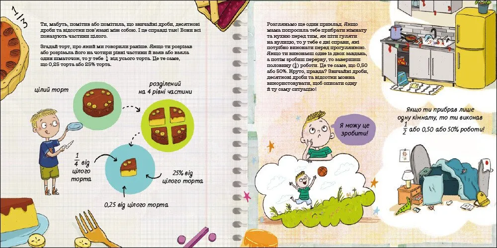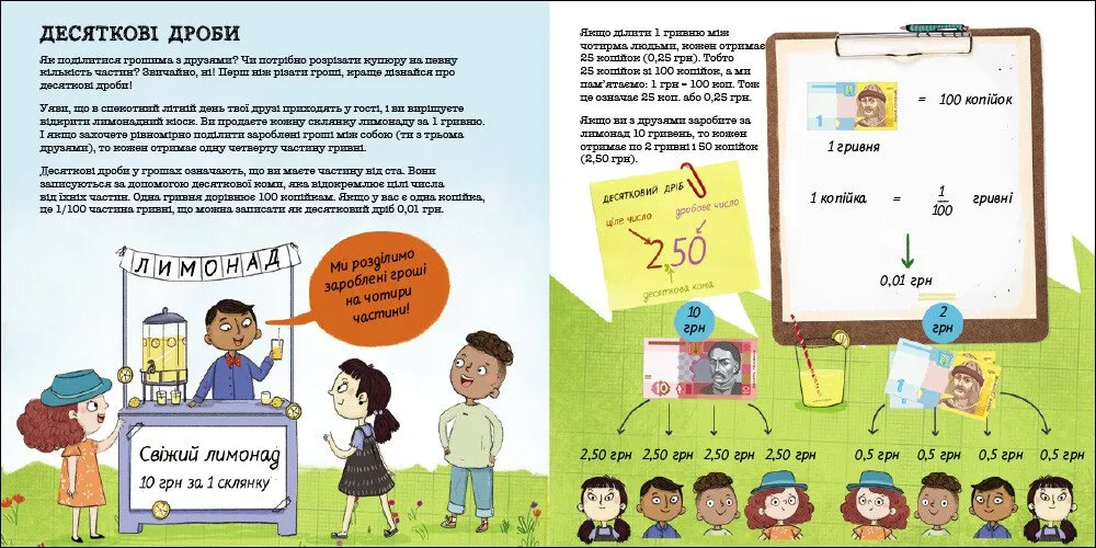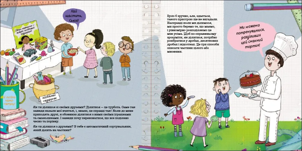 Книжка розрахована на молодший та середній шкільний вік і стане чудовим навчальним ресурсом для школярів, які цікавляться математикою. Її місія — показати, як щодня ми використовуємо дроби: під час покупок у магазині, ділення піци або підрахунку знижок на акційні товари.