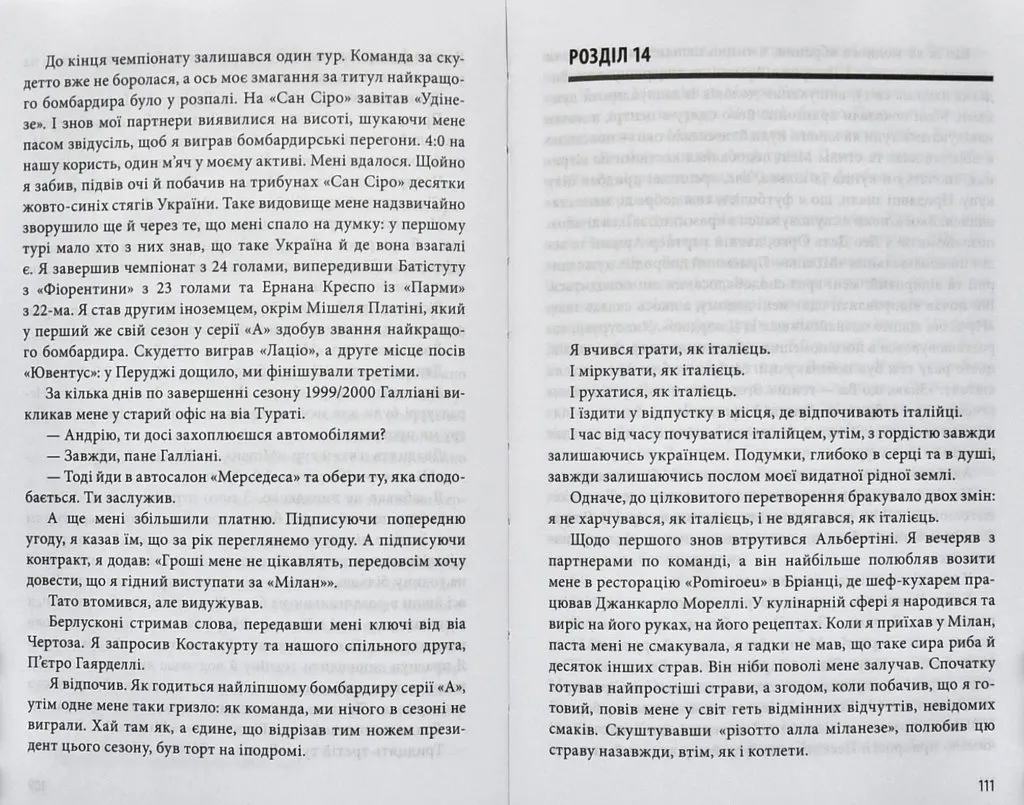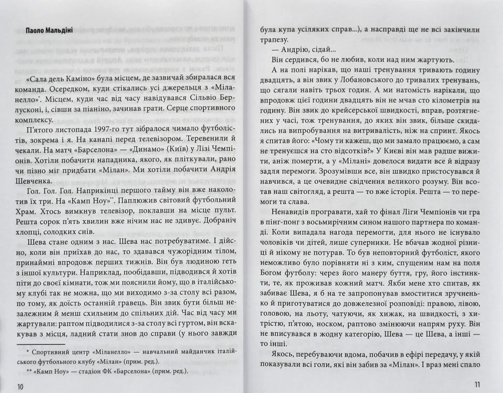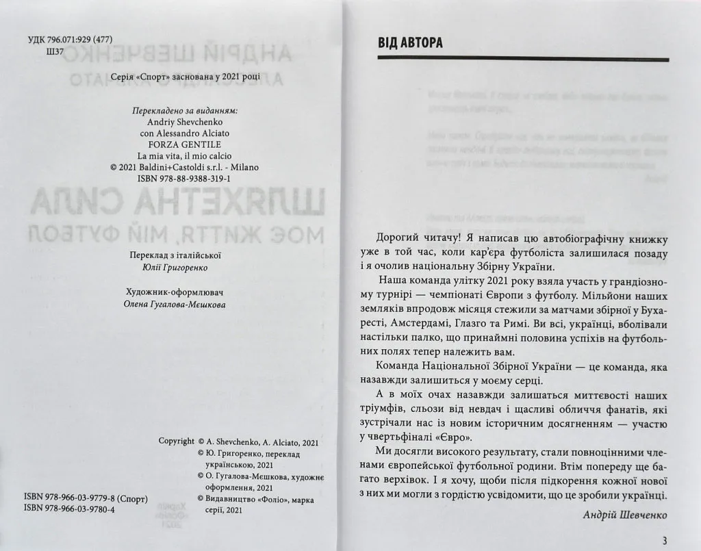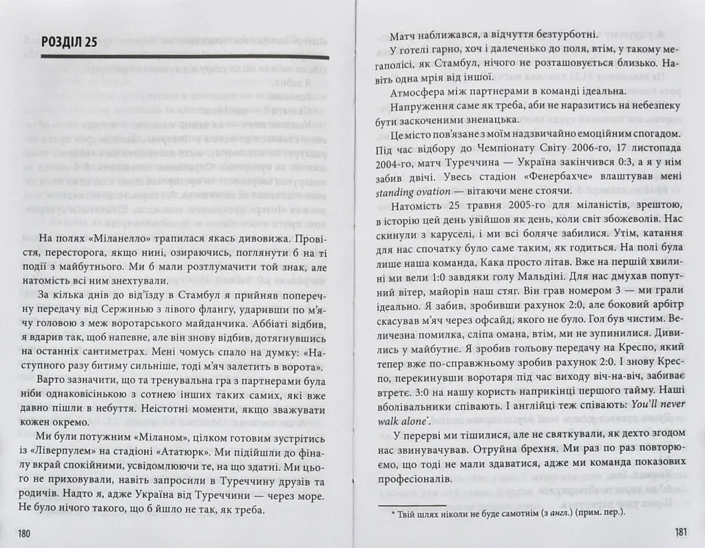 «У мене в житті було чотири футбольні любові: «Динамо», «Мілан», «Челсі» і збірна України... На своєму шляху я познайомився з незвичайними людьми, без яких я б не став тим, ким я є сьогодні. Були перемоги і поразки. Це була величезна жертва заради роботи — єдиного відомого мені способу втілити мрії в реальність. Настав час озирнутися і все розповісти. Щоб подякувати тим, хто супроводжував мене. Я б ніколи не зробив цього сам» (Андрій Шевченко).