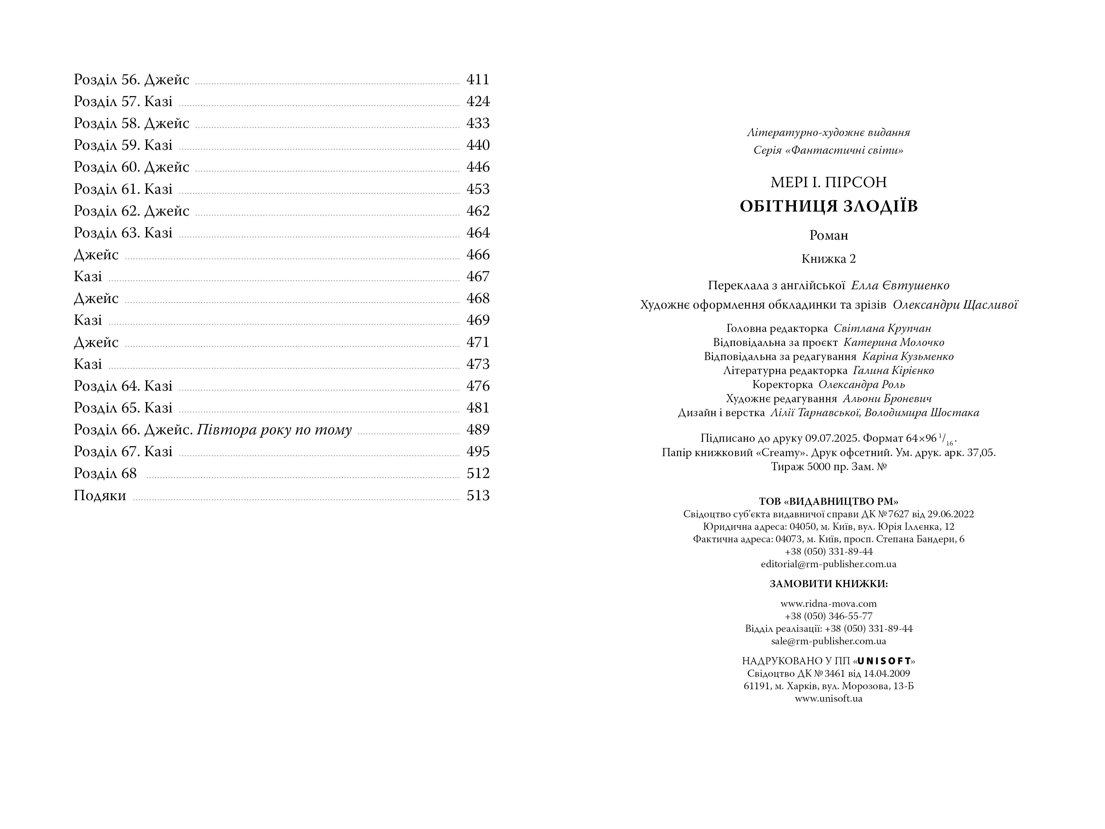 Продовження захопливої фентезійної саги Обітниця злодіїв розкриває нові випробування для улюблених героїв Казі та Джейса. Авторка Мері І. Пірсон, відома поціновувачам жанру молодіжного фентезі, створює неймовірно емоційну історію про кохання, довіру й боротьбу за правду.