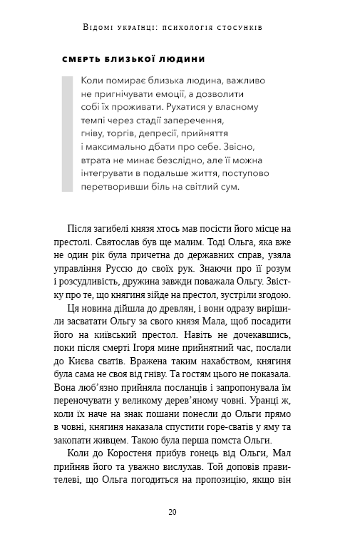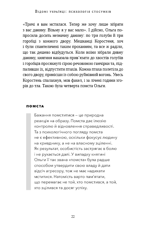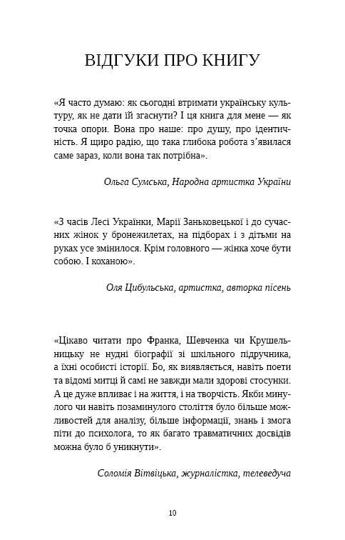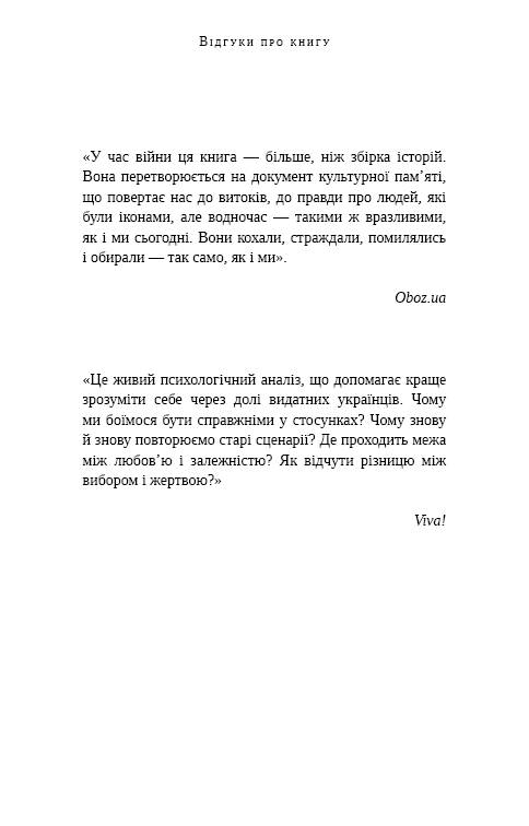 Ця книга не лише відкриває несподівані сторінки життя легендарних українців, а й пропонує психологічний аналіз певних ситуацій і, зрештою, допомагає читачеві краще зрозуміти себе та знайти відповіді на власні емоційні запити.