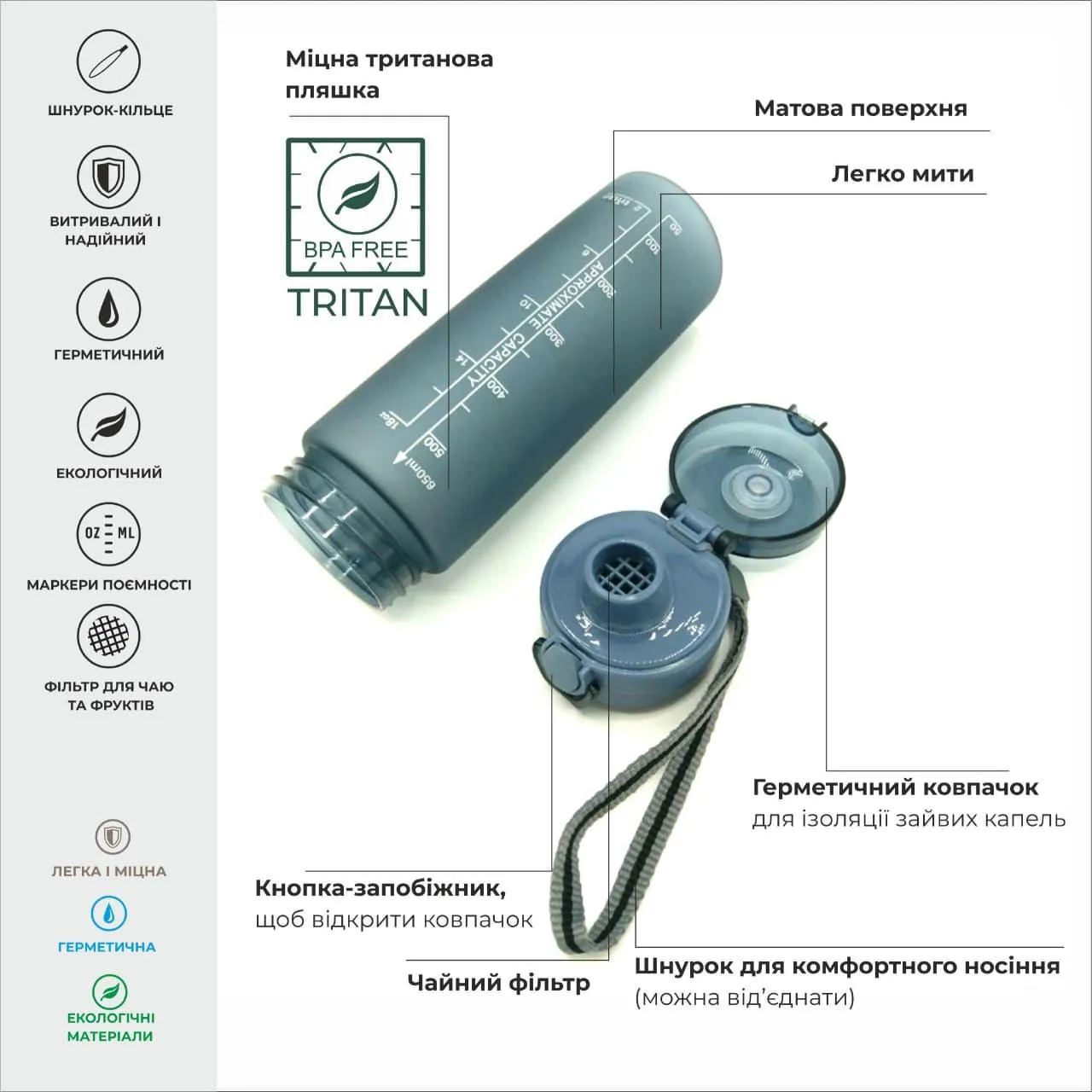 Просто відкрийте пляшку однією рукою, натиснувши на кнопку.Кришка надійно фіксується, що робить її зручною, особливо в дорозі.Засувка надійно фіксує від раптового відкривання.Щільне прилягання кришки надійно захищає від протікання.Ремінець дозволяє зафіксувати пляшку на руці або на рюкзаку, а також швидко виймати з сумки або велотримача.Спеціальний не ковзкий, світловідштовхувальний матовий матеріал корпусу soft touch приємний на дотик, стійкий до пошкоджень.Пляшку зручно тримати в руці.Отвір достатня широкий, щоб використовувати пляшку як шейкер, змішувати напої, кидати всередину кубики льоду.Завдяки широкому горлечку пляшку легко чистити.