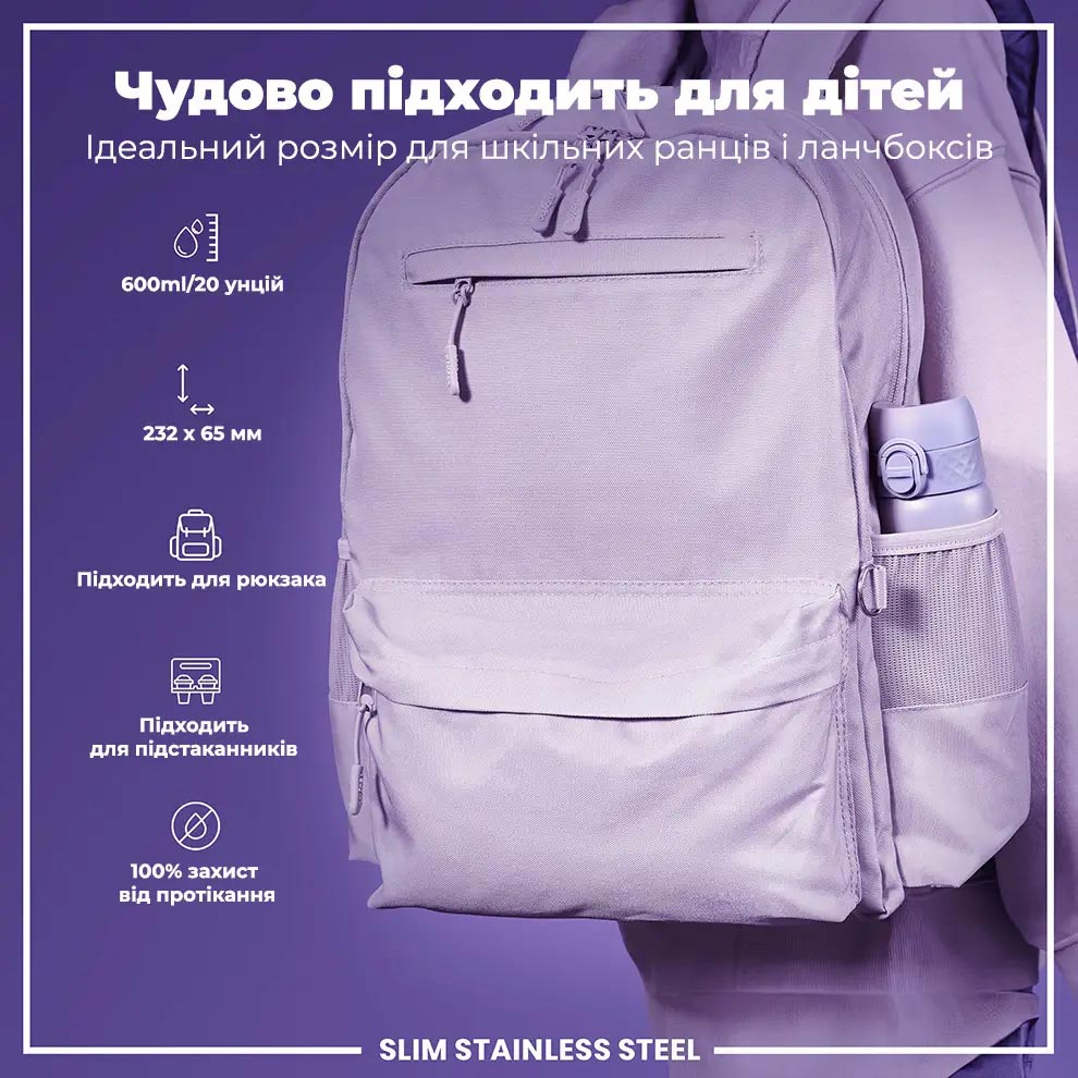 - Об’єм 600 мл дозволяє підтримувати належний рівень гідратації протягом дня