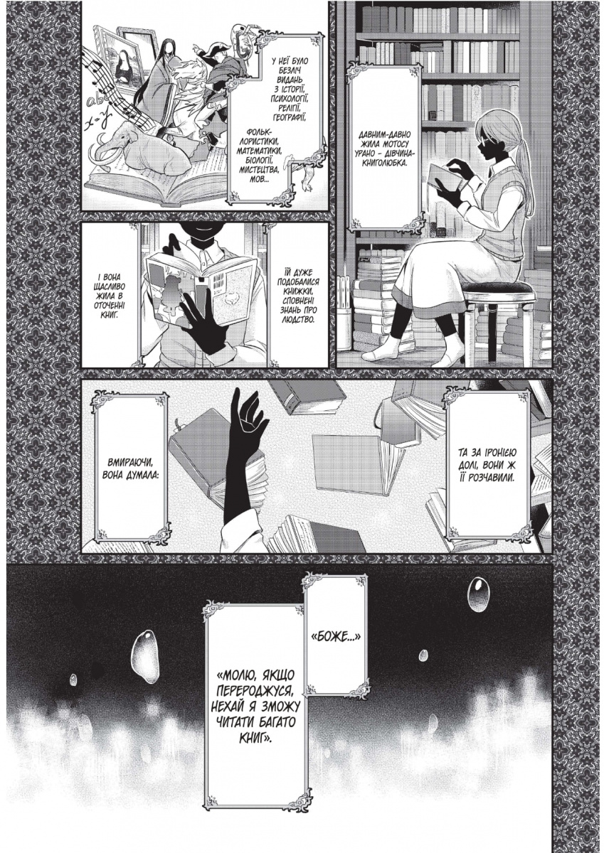 Головна героїня пригодницької манґи — звичайна студентка й велика книголюбка, що трагічно гине і відроджується в новому тілі маленької дівчинки на ім’я Майн у світі, де книги — рідкість, майже недосяжна розкіш. Незважаючи на неграмотність навколишнього світу, Майн твердо вирішує змінити ситуацію. Її мрія — стати бібліотекаркою, передавати знання й приносити світло у темряву неосвіченості.