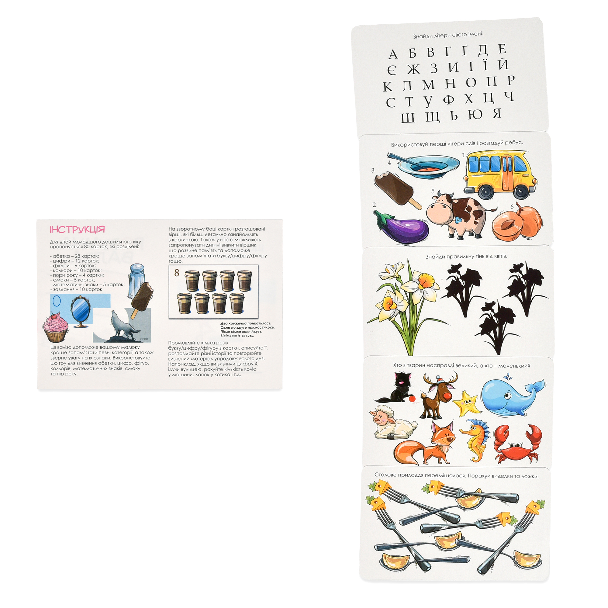 Кожна картка пропонує дитині ознайомлення з літерами алфавіту, цифрами, смаками (солодке, кисле, солоне тощо) та кольорами. Яскравий дизайн та віршовані рядки допомагають краще запам’ятовувати нову інформацію і викликають позитивні емоції у малюка.