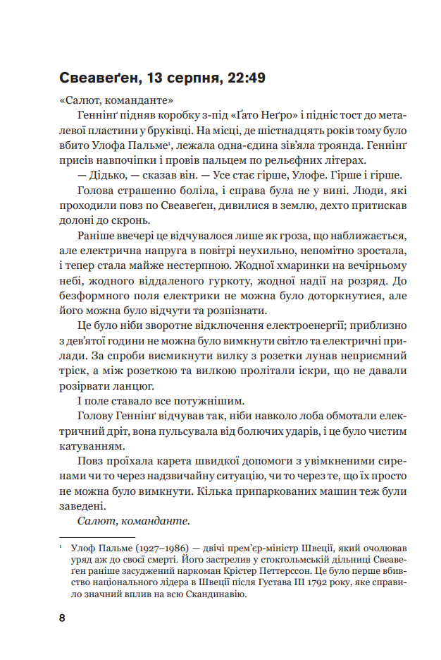 Звичайного серпневого вечора Стокгольм охоплює аномальна спека. Люди скаржаться на головний біль, місто ніби поринає в електричне поле: прилади і світло неможливо вимкнути, наростає паніка. Аж раптом усе припиняється.