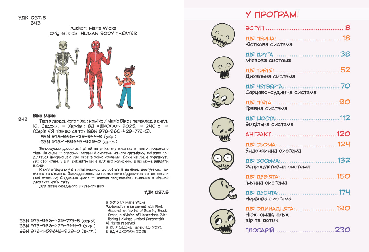 Книга Театр людського тіла — це захоплива подорож у світ людської анатомії, представлена у формі яскравого коміксу. Видання входить до серії Я пізнаю світ і ідеально підходить для дітей середнього шкільного віку. У книзі органи і системи людського тіла виступають на сцені театру, щоб розповісти про свої функції, особливості та способи турботи про них.