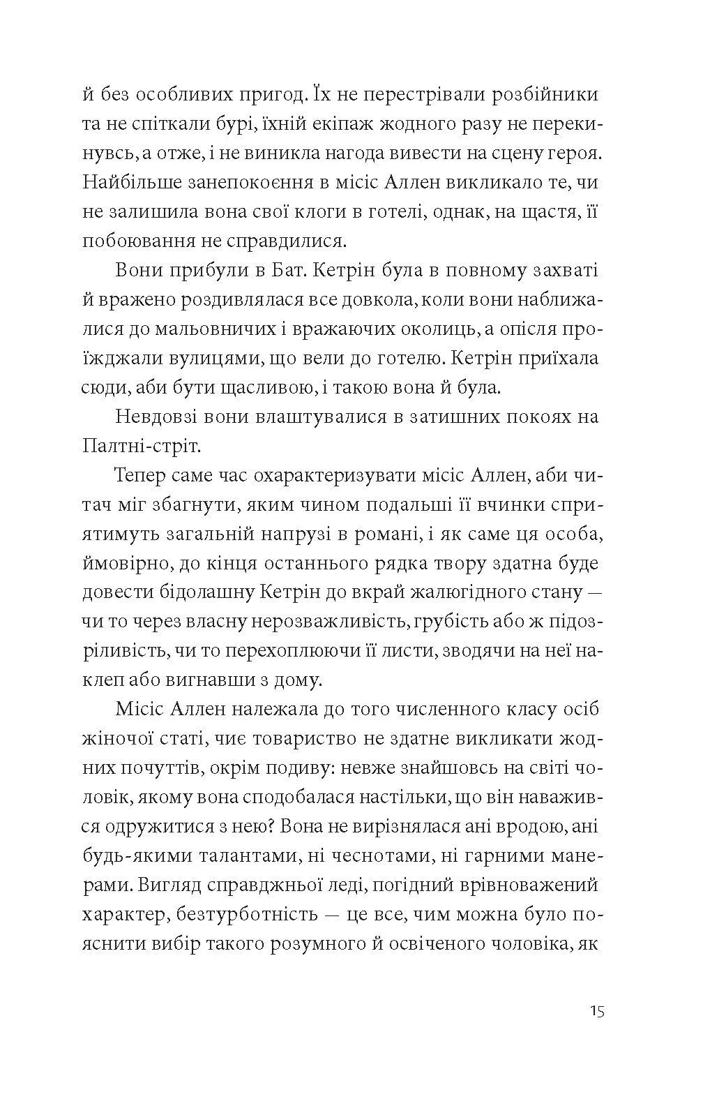 Головна героїня, Кетрін Морланд, не є класичною літературною героїнею. Вона — проста дівчина родом із середнього класу, без особливої освіти. Зате вона обожнює читати романи, зокрема готичні історії Енн Редкліфф. Потрапивши на курорт Бат разом зі своїми опікунами, Кетрін знайомиться з багатьма новими людьми: сім’єю Торпів і родиною Тілні.
