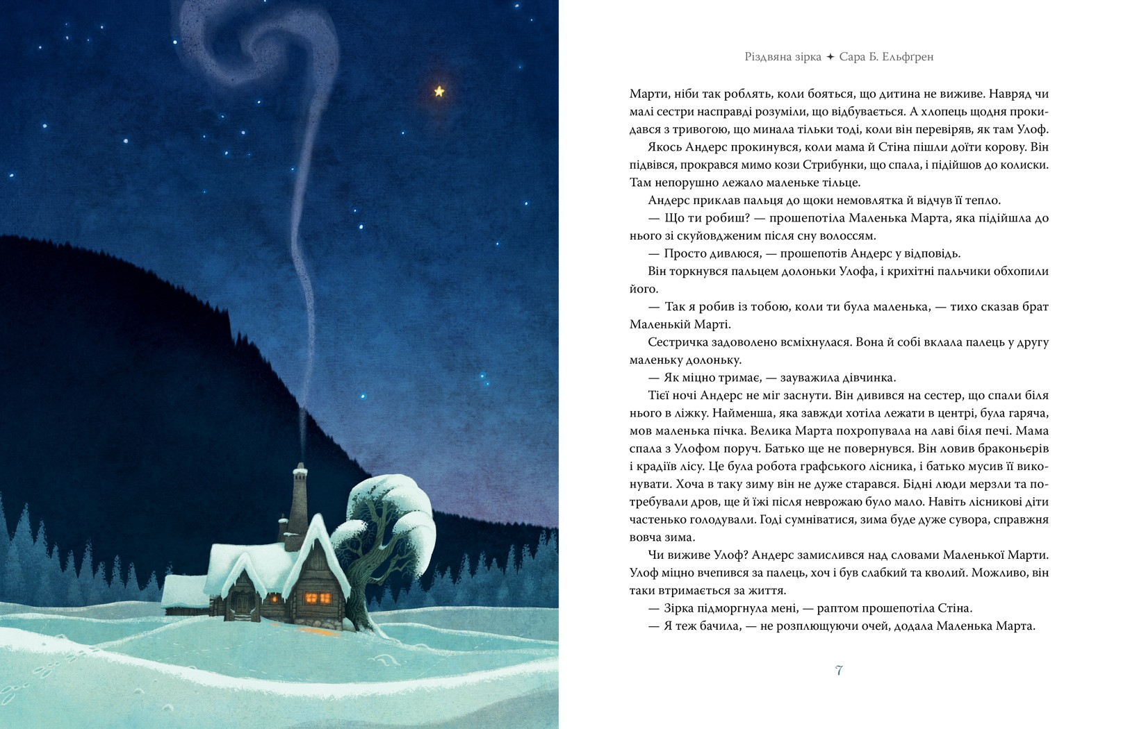 Книга Різдвяна зірка — це тепла зимова казка про дружбу, віру в диво та справжню магію Різдва. Автор розповідає про захопливу пригоду трьох дітей — Андерса, Стіну та Маленьку Марту, які прагнуть урятувати свого новонародженого братика Улофа від лютої зими.