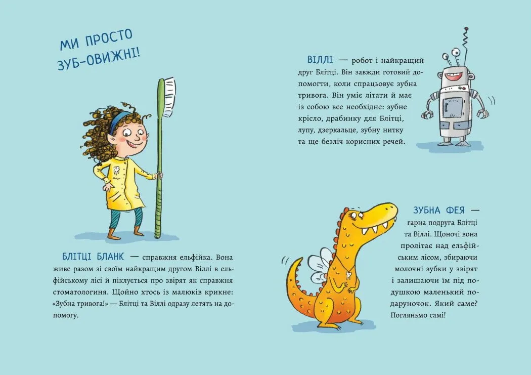 До книжки входить 12 захопливих історій, кожна з яких присвячена певному аспекту догляду за зубами. Читачі дізнаються, що робити, коли хитається зуб, як обрати зубну щітку та чому важливо чистити зуби щодня. Герої показують, що зубна гігієна може бути веселою пригодою, а не обтяжливою рутиною.