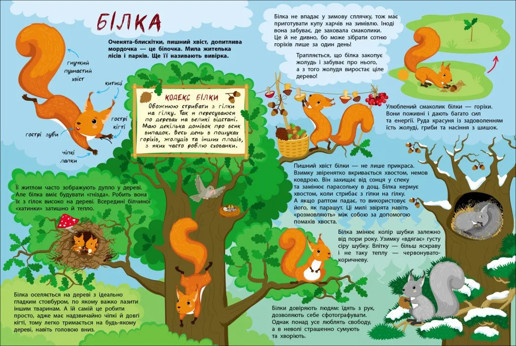 Це надзвичайно пізнавальна та добре ілюстрована книга, у якій юні читачі дізнаються про повсякденне життя лісових тварин. Авторка захопливо описує, як: