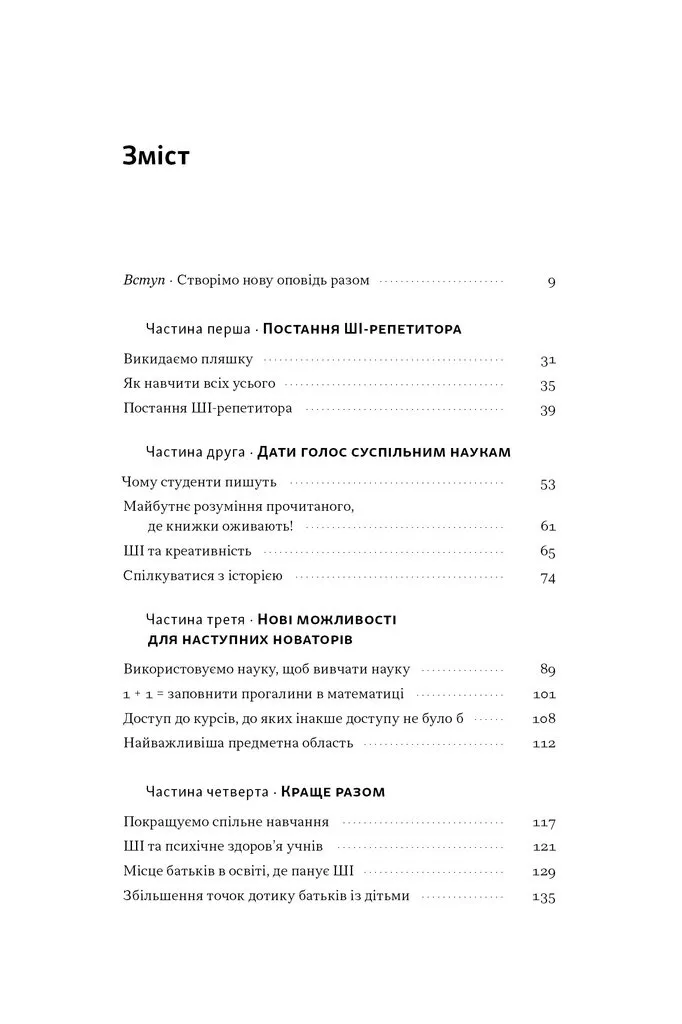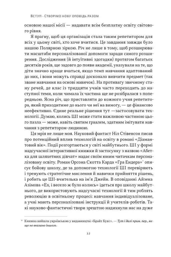 Ця книга змальовує освітню революцію, що вже почалася. Автор надає конкретні поради, як ефективно використовувати ШІ у викладанні та опануванні нових знань, розповідає про переваги персоналізованого навчання та демонструє приклади успішного впровадження технологій у школах і вишах.