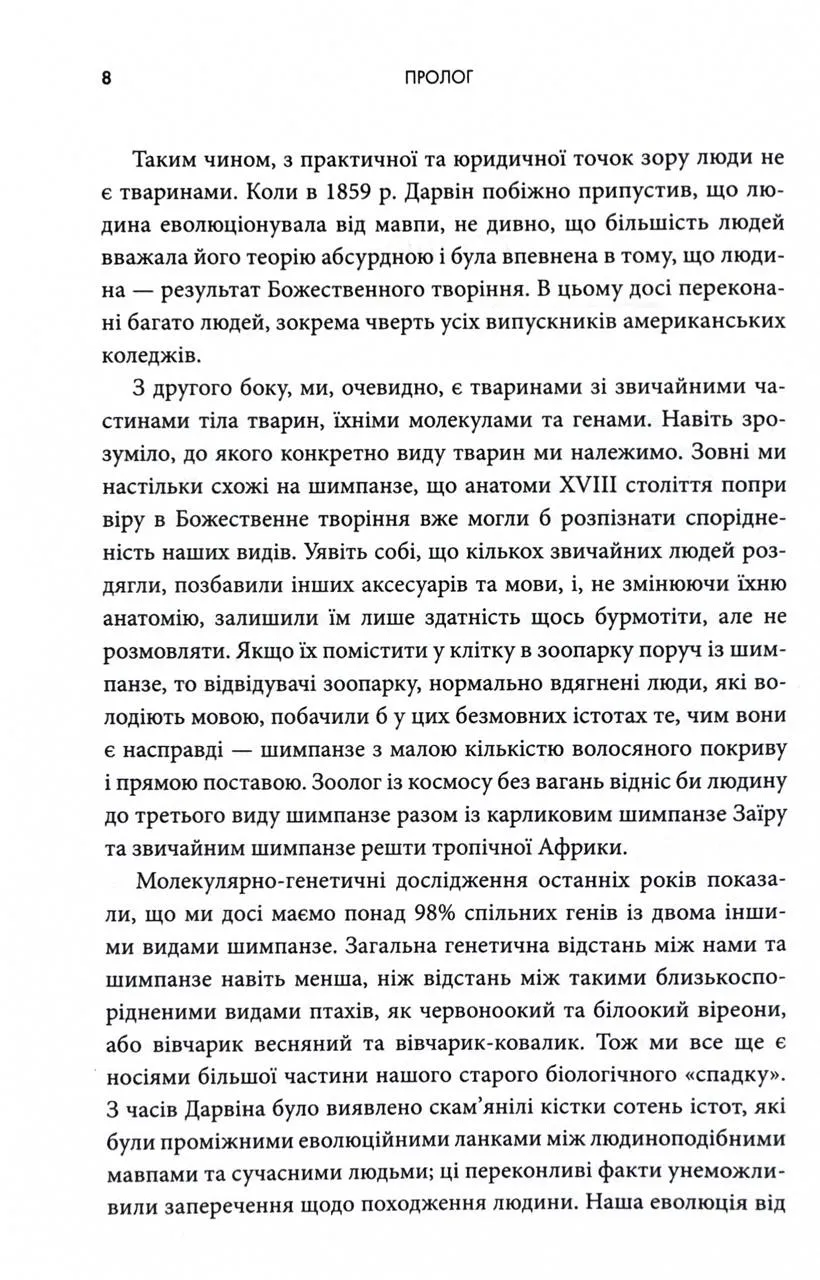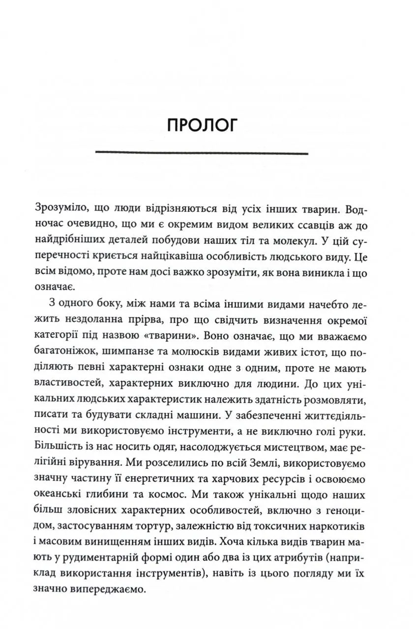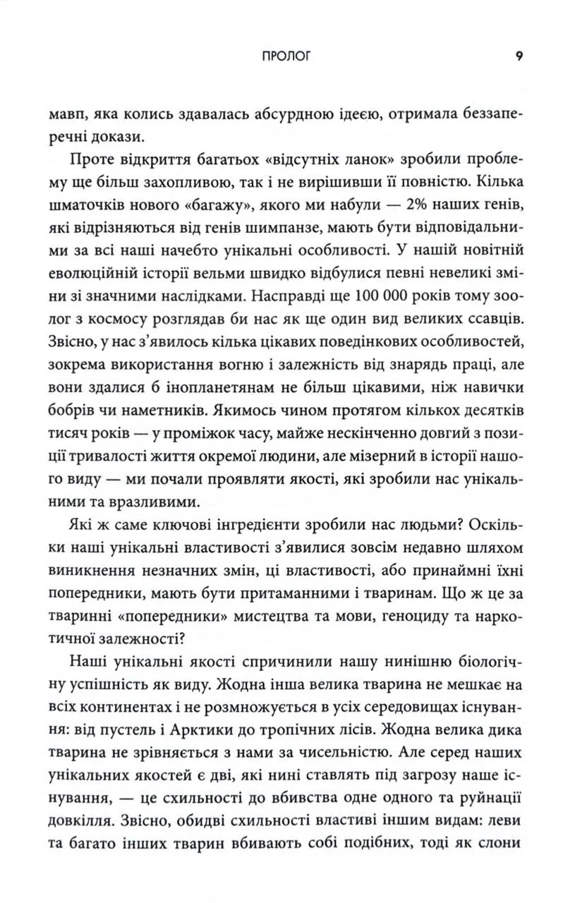 Ця книжка розкриває питання, що турбує багатьох: якщо люди та шимпанзе поділяють 98% генетичного коду, чому ми настільки різні? Як людство змогло за короткий час стати домінуючим видом, збудувати цивілізації, мистецтво і науку, в той час як інші види залишилися у дикій природі, піклуючись лише про виживання?