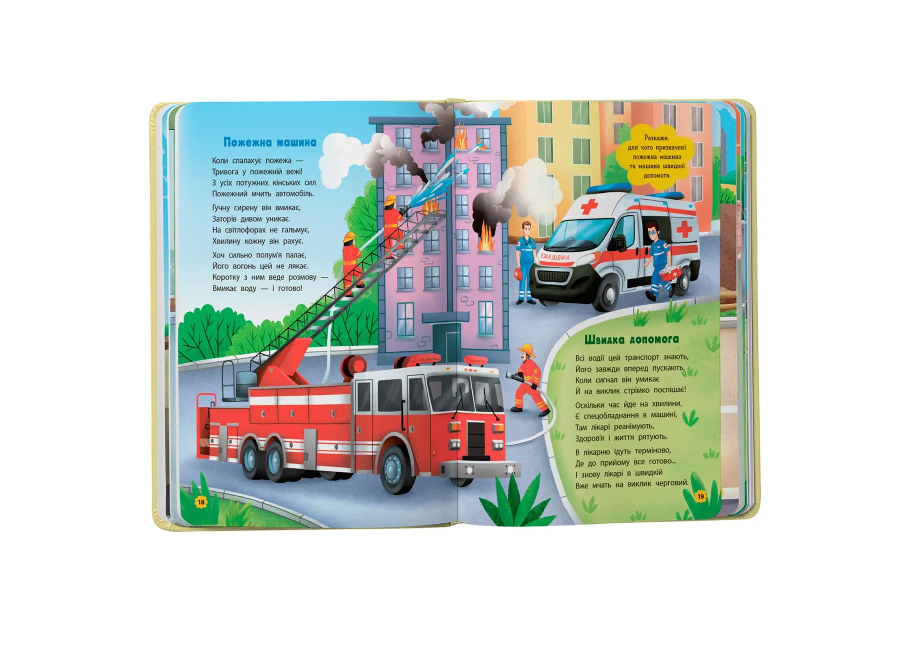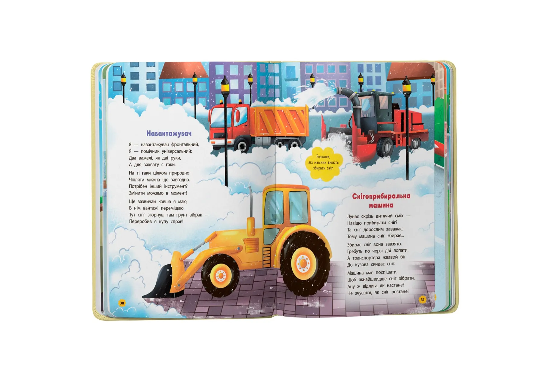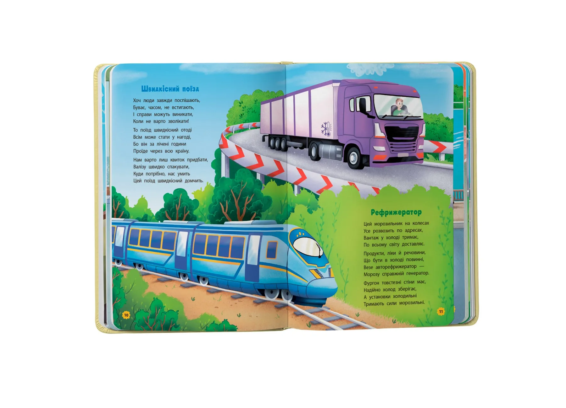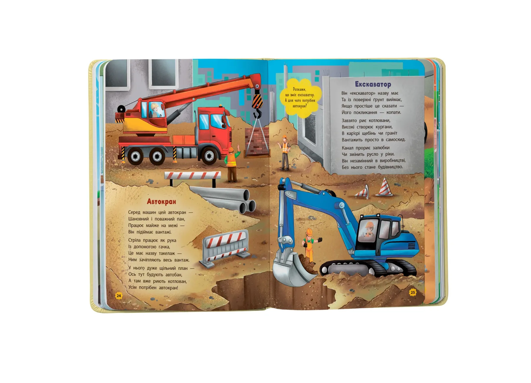У виданні зібрано короткі віршики про різні види транспорту: від легкових машин до поїздів, кранів та екскаваторів. Кожен вірш має ритмічну структуру, що допомагає дитині легко запам’ятовувати нові слова та розвивати мовлення. У паралелі з художнім текстом дитина дізнається, як функціонують найрізноманітніші машини, та яку роль вони відіграють у нашому повсякденному житті.