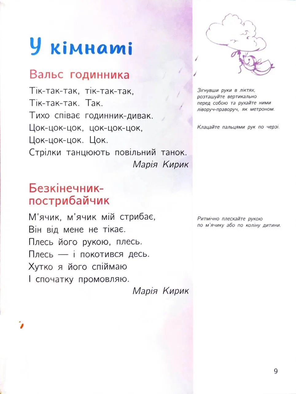 Матеріал дозволяє плекати у дитини емоційний зв'язок з дорослими, формує відчуття безпеки та сприяє мовленнєвому й сенсорному розвитку. У книзі подано короткі, ритмічні тексти легкої форми — вони запам’ятовуються та викликають у дітей радість від взаємодії з батьками.
