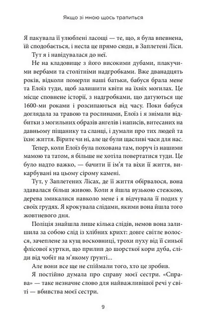 Книга Якщо зі мною щось трапиться авторства Луанн Райс — це глибокий психологічний роман з нотками детективу, емоційної драми та містики. Видання розповідає історію Олі Перріш — юної дівчини, яка втратила свою сестру. Елоїз було знайдено мертвою в лісі, і хоча пройшли місяці, вбивцю так і не знайдено.