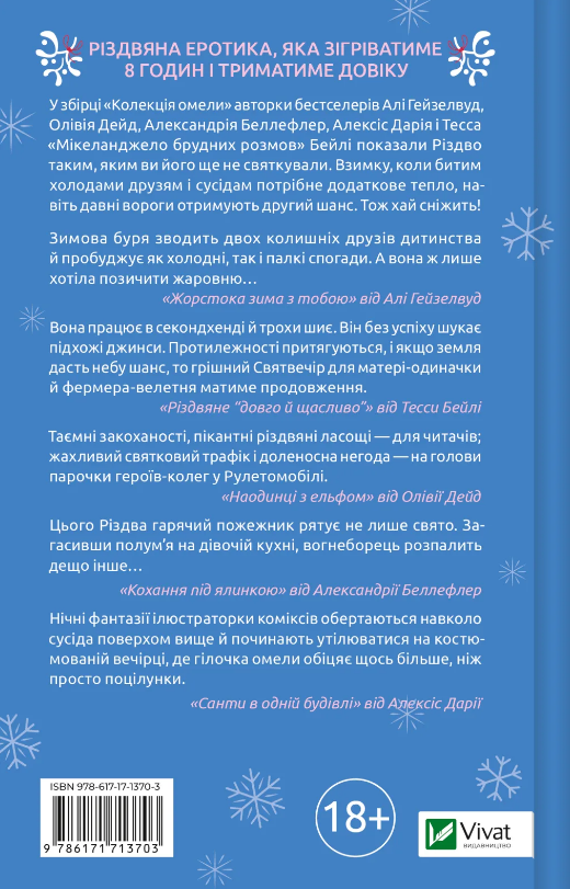 У збірці «Колекція омели» авторки бестселерів Алі Гейзелвуд, Олівія Дейд, Александрія Беллефлер, Алексис Дарія і Тесса «Мікеланджело брудних розмов» Бейлі показали Різдво таким, яким ви його ще не святкували. Взимку, коли битим холодами друзям і сусідам потрібне додаткове тепло, навіть давні вороги отримують другий шанс. Тож хай сніжить!