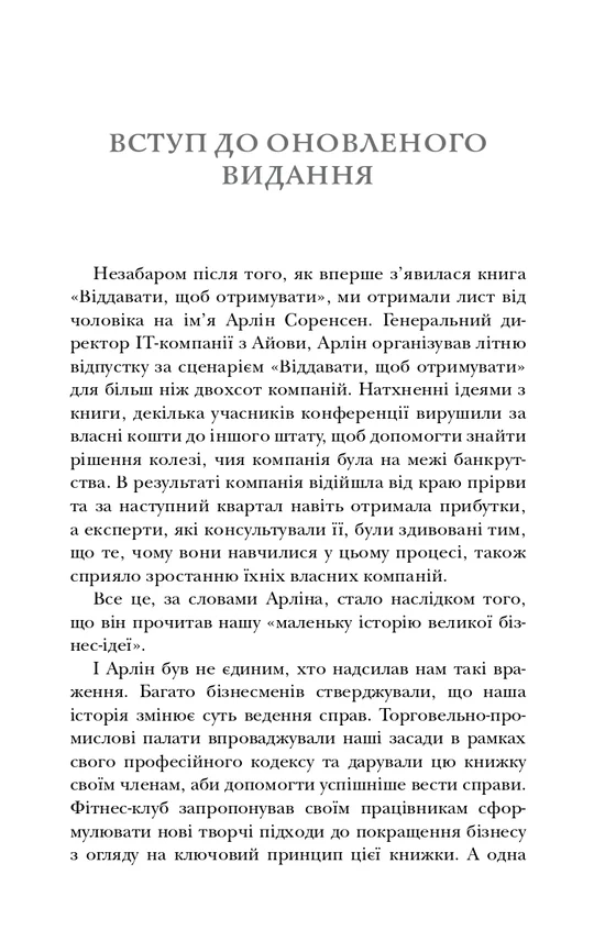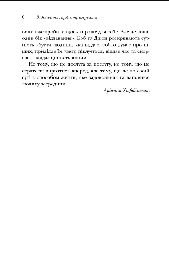 Основний меседж книги — віддавати, щоб отримати. Це означає, що найкращі результати приходять не тоді, коли ми тільки беремо, а коли щиро ділимося знаннями, енергією, часом та ресурсами. Такий підхід відкриває шлях до глибоких стосунків, довіри та стабільного професійного зростання.