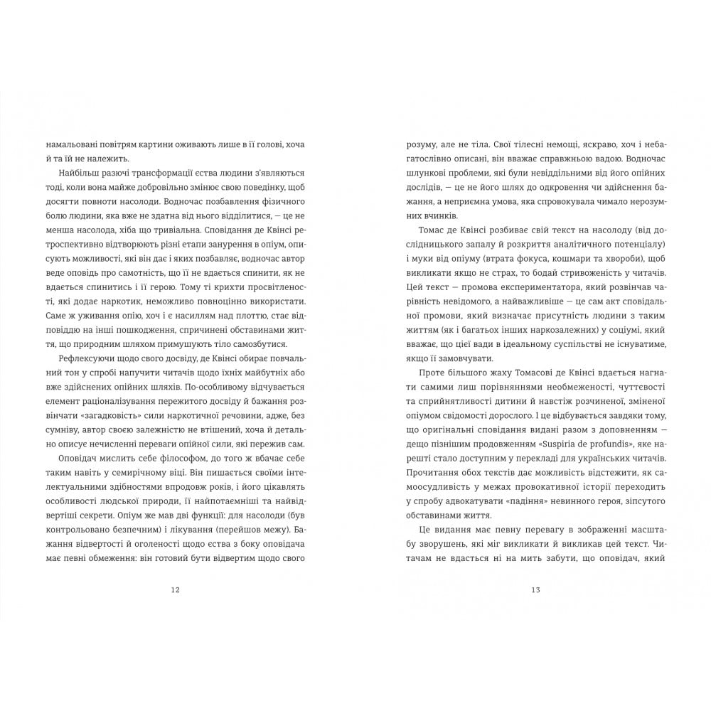 Книга Suspiria de Profundis, яка вперше публікується українською мовою, є продовженням Сповідання. Тут автор фокусується на соціальному, моральному й особистісному падінні, що супроводжує залежність. Його одкровення — це не тільки опис болю, а й спроба зрозуміти себе та передати досвід майбутнім поколінням.