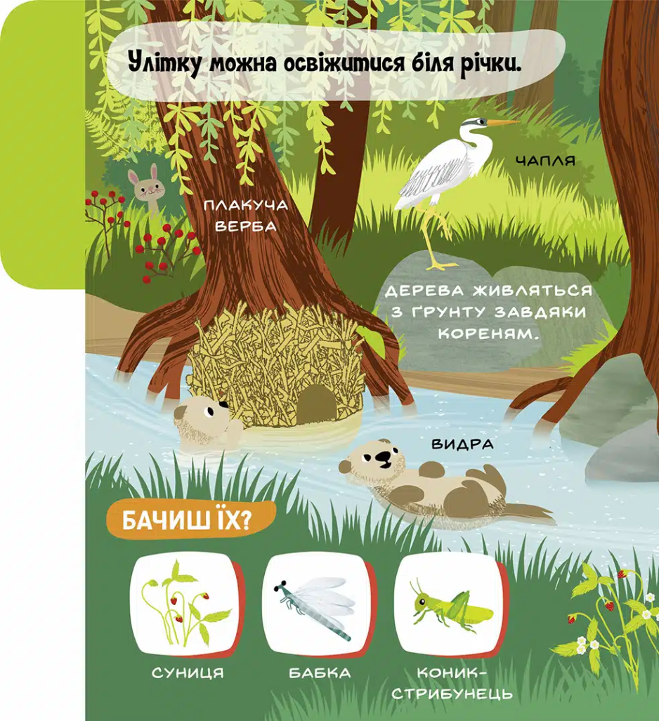 - Яскраві ілюстрації знайомлять з мешканцями лісу.