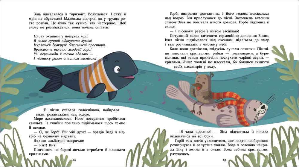 Маленькі герої оповідань — тюленятко, китеня, пінгвіненятко та поморник — несуть універсальні для всіх дітей почуття: любов, страх, мрію, допитливість та бажання знайти друга. Їхні пригоди відкривають дітям глибші сенси, дозволяють задуматись про важливе й надихають вірити у диво.