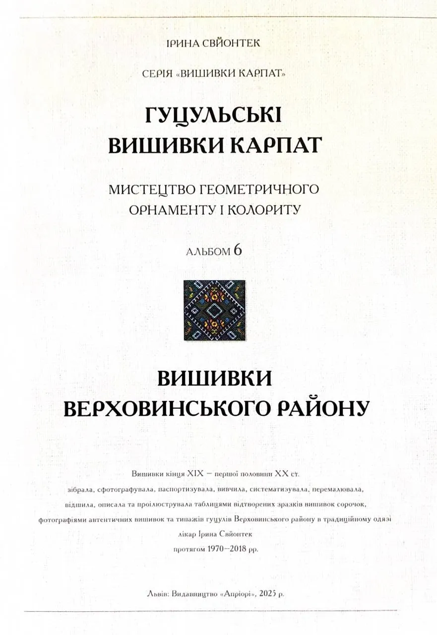 Гуцульська вишивка — це не просто народне мистецтво, а справжній культурний код Карпатського регіону. Альбом Гуцульські вишивки Карпат. Мистецтво геометричного орнаменту і колориту авторства Ірини Свйонтек є шостим у серії «Вишивки галицьких Карпат» та присвячений понад столітній традиції вишивки Верховинського району.