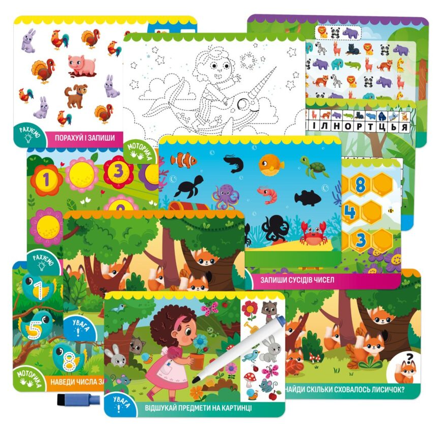 - Багаторазове використання: Спеціальне ламіноване покриття дозволяє виконувати завдання знову і знову. Завдяки маркеру, що легко видаляється, діти не бояться помилок та можуть відпрацьовувати навички до впевненості.