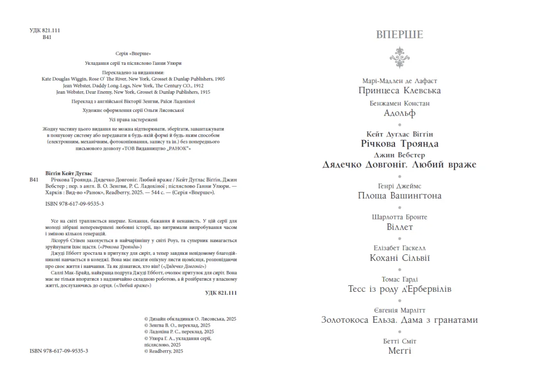 Історії Джин Вебстер та Кейт Дуґлас Віґґін — це чарівні історії про жіночий шлях у світі, сповненому викликів, виборів і відвертого романтизму. У серії класичних творів представлені одразу три бестселери: Дядечко-довгоніг, Любий враже і Річкова троянда, які відкривають перед читачами чарівний світ переживань, пошуків і першого справжнього кохання.