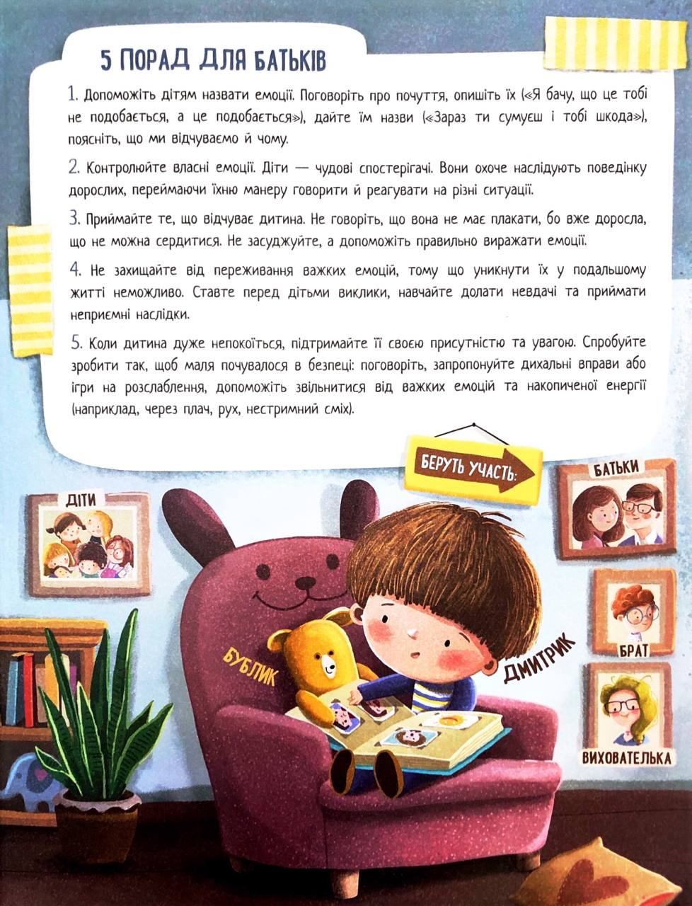 Ця історія вчить дитину не боятися власних почуттів, а приймати їх і висловлювати належним чином. Завдяки емоційним сценам Дмитрика та поясненням іграшкового ведмедика, дитина легше зрозуміє власні реакції та навчиться керувати ними з любов’ю та повагою до себе та інших.
