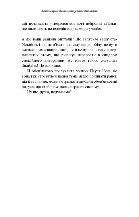 Книга відомого психіатра, психотерапевта й дослідника, професора Олега Чабана — своєрідне літературне втілення відомого однойменного ютуб-циклу. Тут ви знайдете поради на різні випадки життя, розмірковування, які змусять вас подивитися на ту чи ту ситуацію під іншим кутом зору, мотиваційні історії й просто тексти, які надихнуть, підтримають, вкажуть на щось нове. Звісно, у книзі звучатиме музика, як і у відео, однак дещо по-іншому. А надихаючі тексти тепер зазвучать вашим власним голосом.