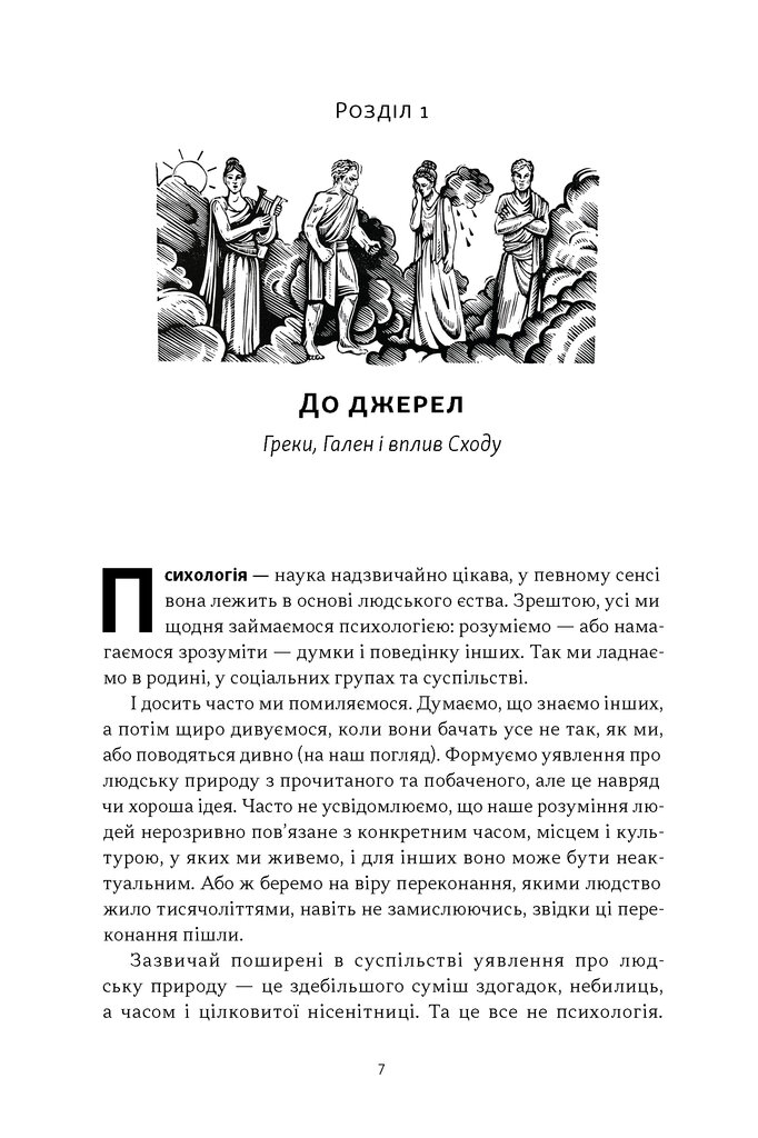 У 40 динамічних і логічно структурованих розділах авторка знайомить читача з видатними особистостями, революційними теоріями та експериментами, які сформували сучасну психологію. Від Платона і Арістотеля до сучасних нейропсихологів, від психоаналітичних ідей Фройда до наукових підходів Деніеля Канемана — кожен розділ відкриває новий горизонт в розумінні людської свідомості.