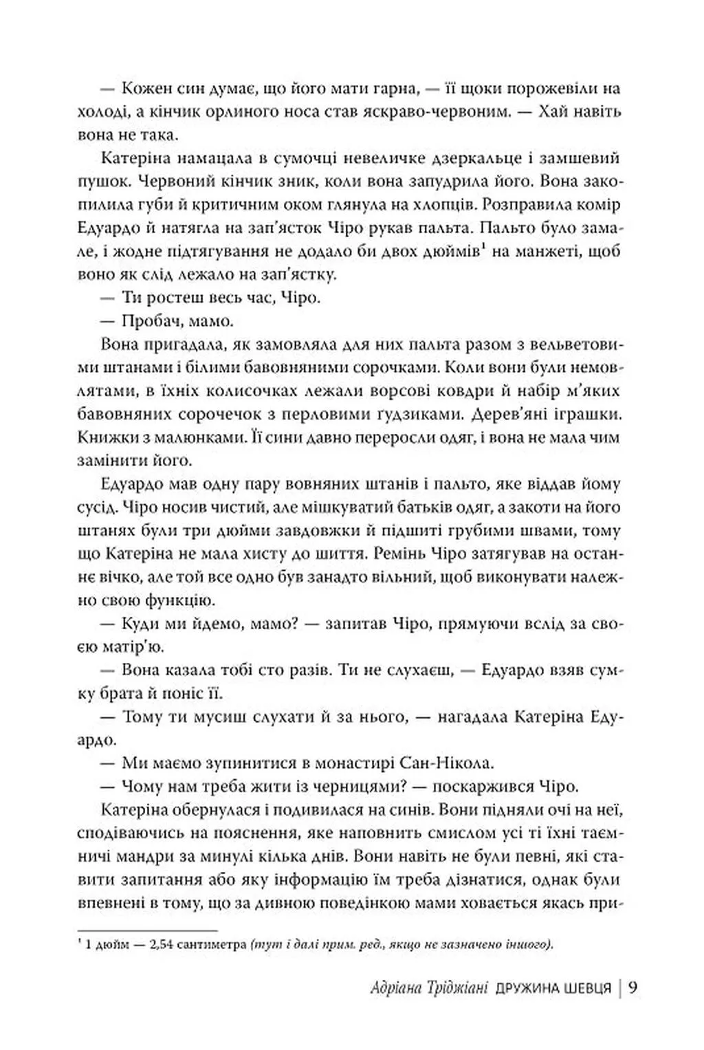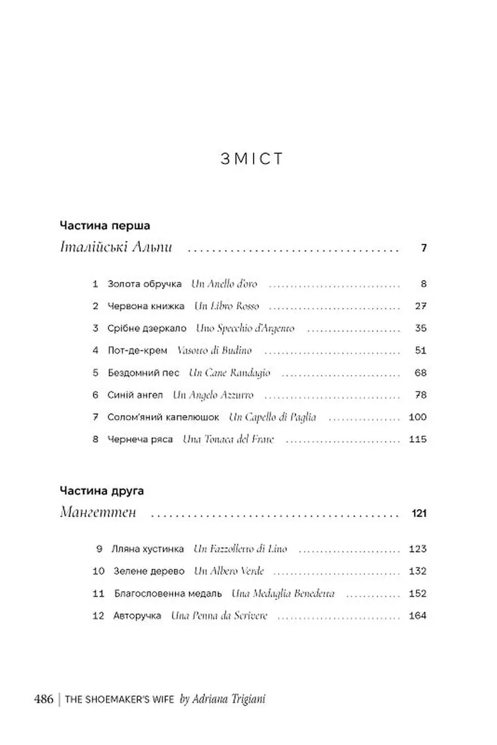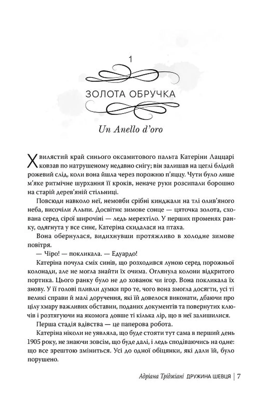 Книга Дружина шевця авторства Адріани Тріджіані — це епічна історія кохання та випробувань, що охоплює початок ХХ століття та переносить читача від італійських Альп до гамірного Нью-Йорка. У центрі сюжету — двоє молодих людей, Енца та Чіро, які виростають неподалік один від одного в гірських селах, але розлучаються через обставини поза їх контролем.