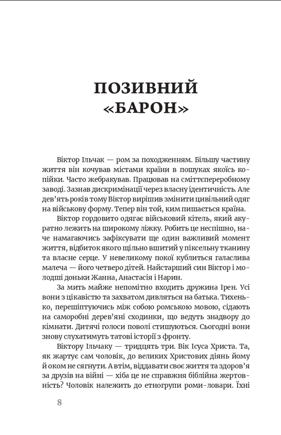 Це багатогранна й цілісна робота, що відкриває українських ромів як особистостей — відданих своїй справі, складних, суперечливих, іноді наївних, але завжди живих і справжніх. Книга також торкається урбаністичних контекстів: її герої живуть у різних містах України, віддалених географічно й культурно. Серед них — військові, правозахисники, дослідники, письменники й «звичайні» роми, які щодня долають життєві виклики. Це історії, що мають потенціал змінити суспільне сприйняття ромів в Україні.