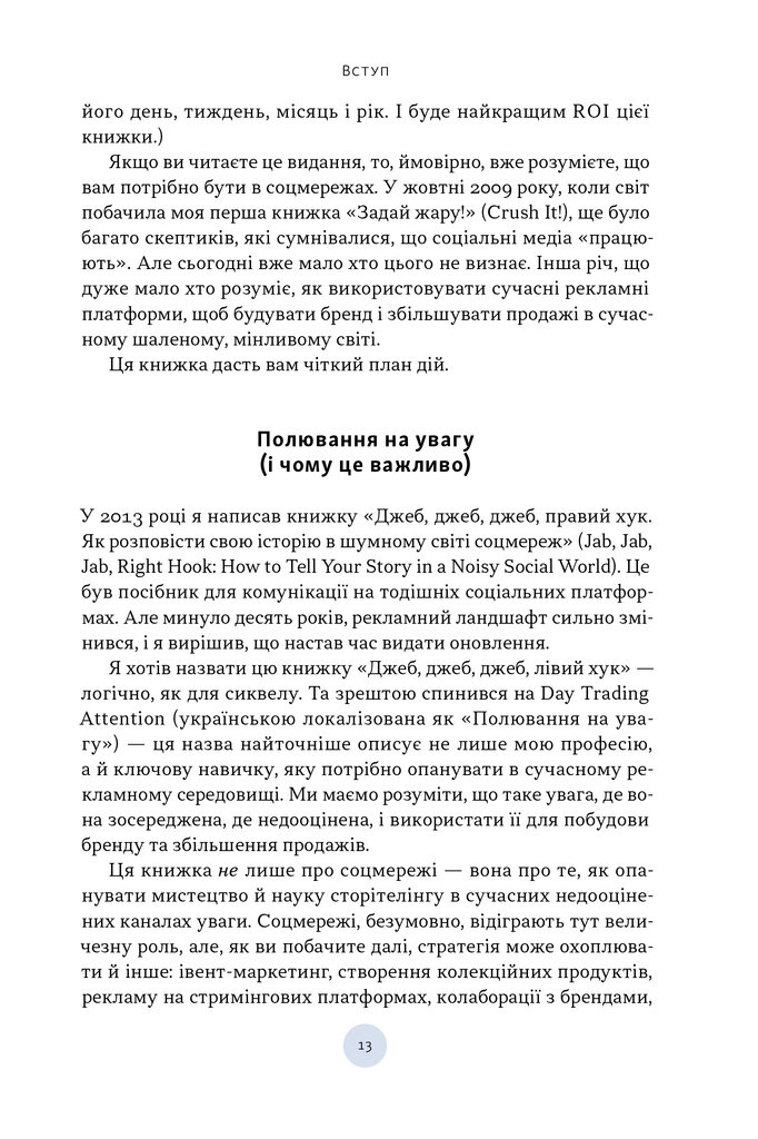 Полювання на увагу. Як насправді побудувати бренд і збільшити продажі в новому світі соцмереж від Ґері Вайнерчука — практичний і провокативний гід для тих, хто хоче навчитися працювати з головною валютою сучасності — увагою.
