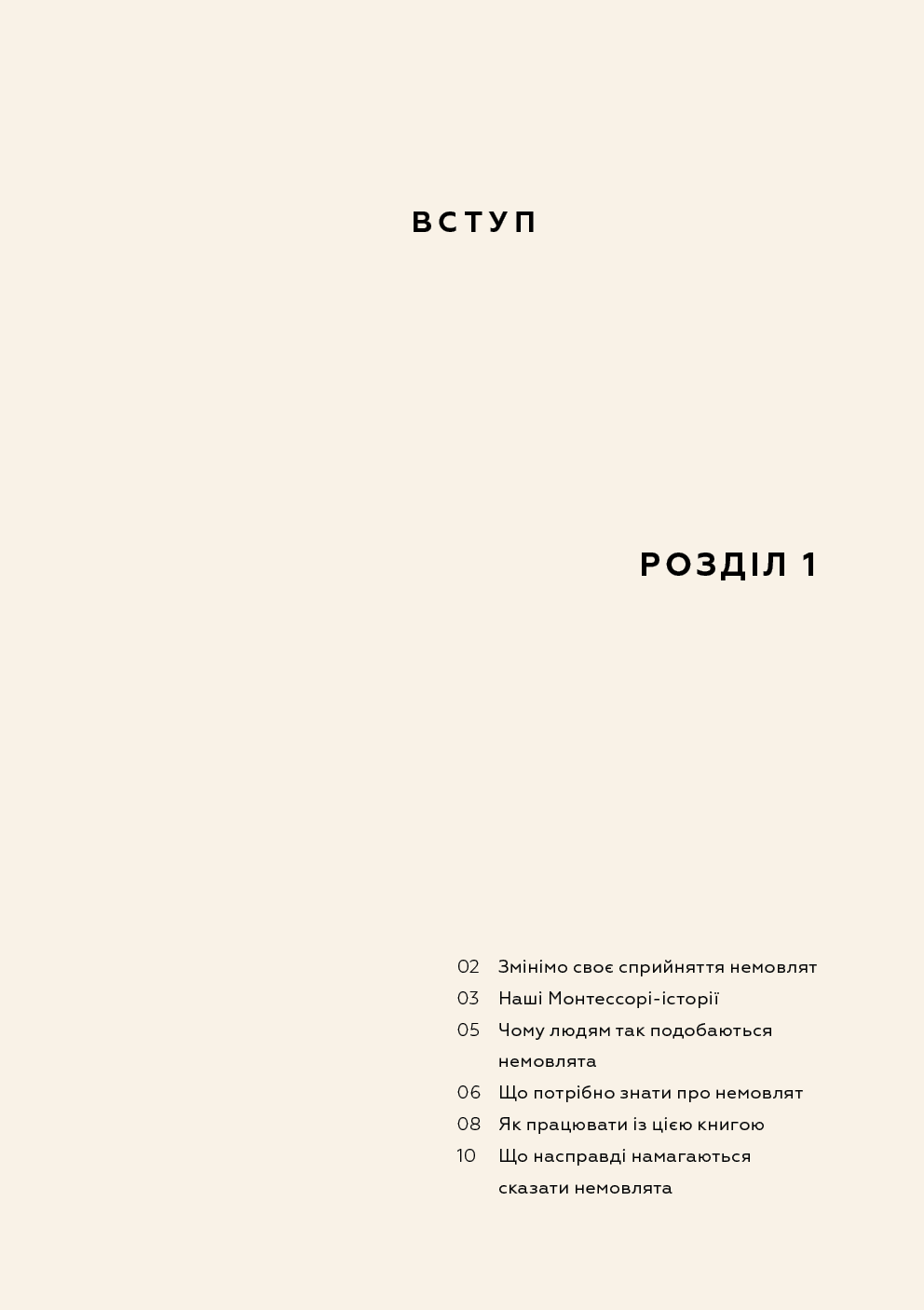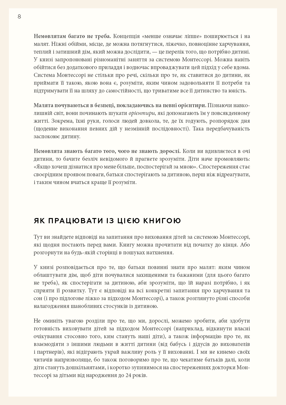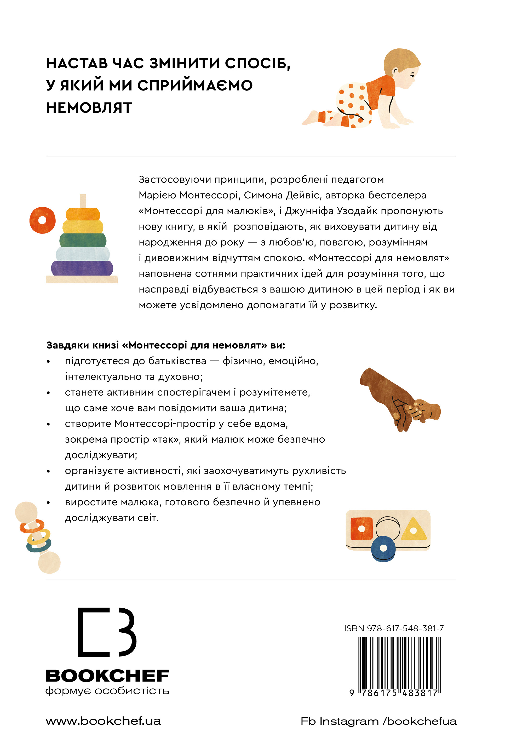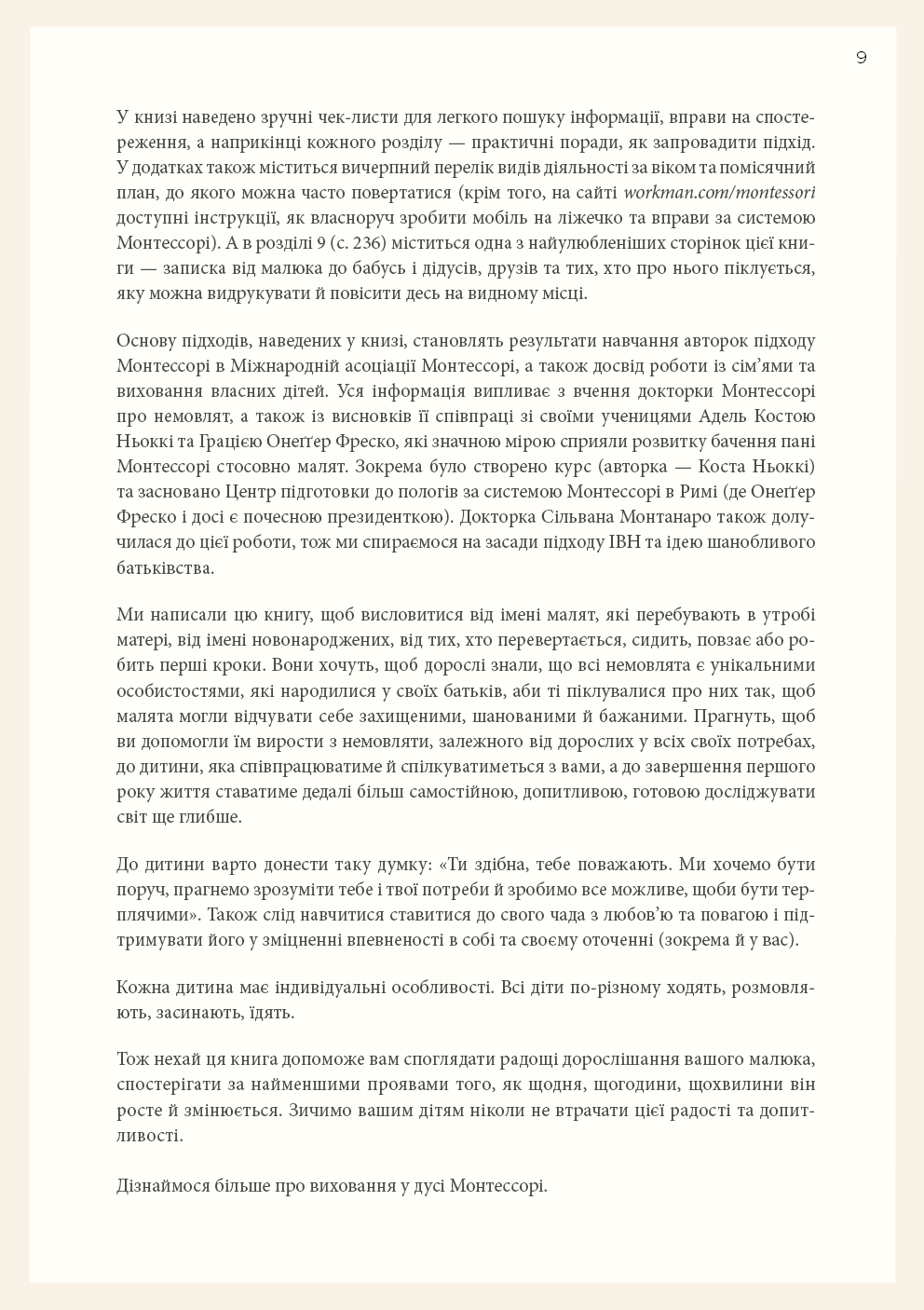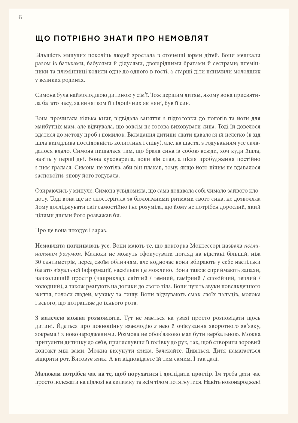 Колись немовлят вважали тендітними, пасивними істотами, здатними лише їсти, спати й плакати, тож найкраще, що могли робити батьки, — це загорнути дитину в теплу ковдру та слідкувати, щоб вона була чистою і ситою. А потім з’ясувалося, що діти з моменту народження прагнуть сприймати доступну їм інформацію про навколишній світ, тож завдання батьків — створити всі умови для того, аби дитина вже в перші місяці свого життя могла задовольняти свої пізнавальні потреби. Симона Дейвіс, авторка бестселера «Монтессорі для малюків», пропонує дозволити дитині керувати процесом пізнання. Спочатку варто поспостерігати за дитиною, а не кидалися керувати нею, потім — відмовитися від нав’язаних маркетингом іграшок і замість цього забезпечити простий, красивий простір для її розвитку. Однак найважливіше — зрозуміти, що кожна дитина — унікальна і що наша роль — бути провідником, який допоможе їй вирости в найкращу версію себе без тиску з нашого боку. Усього цього авторка навчає молодих батьків, педагогів і вихователів у книзі «Монтессорі для немовлят».