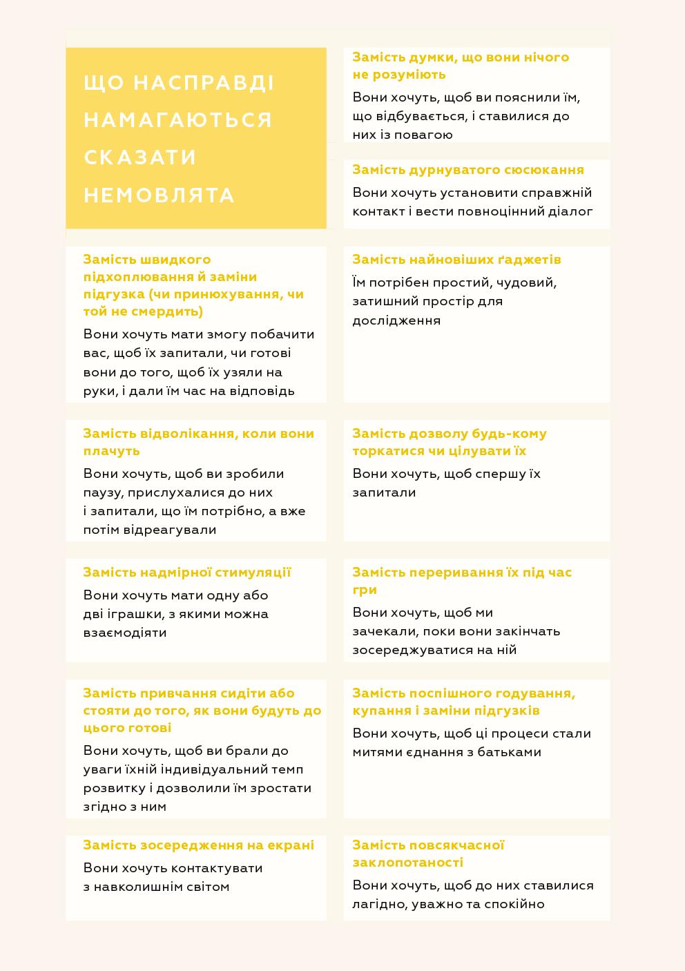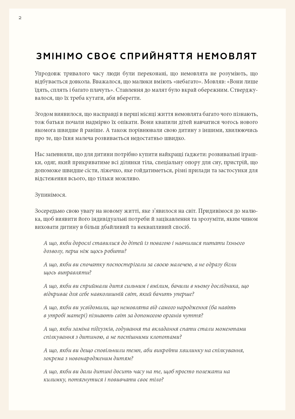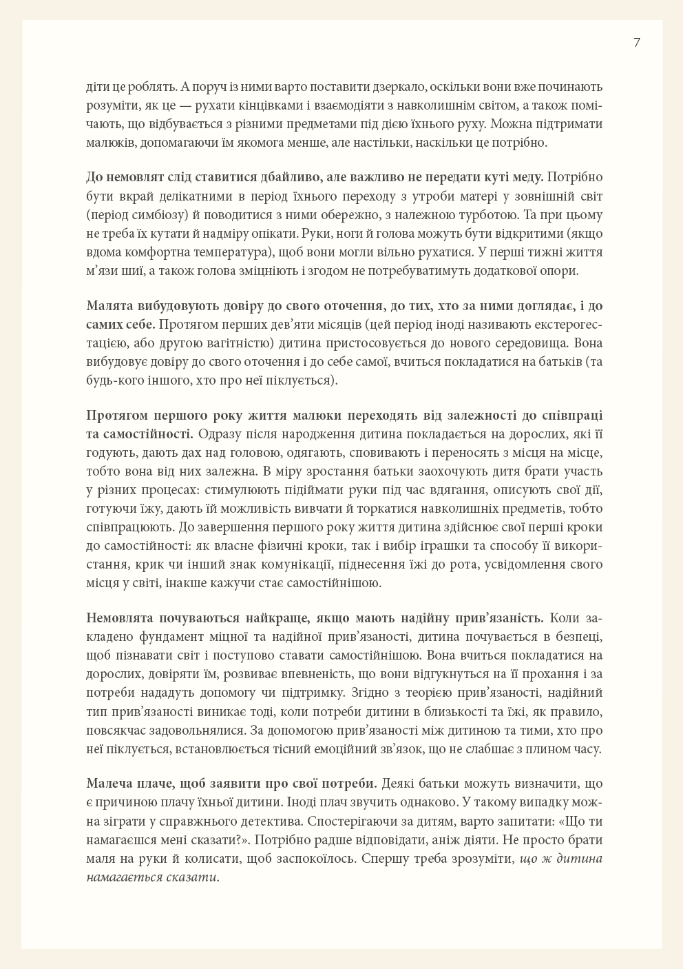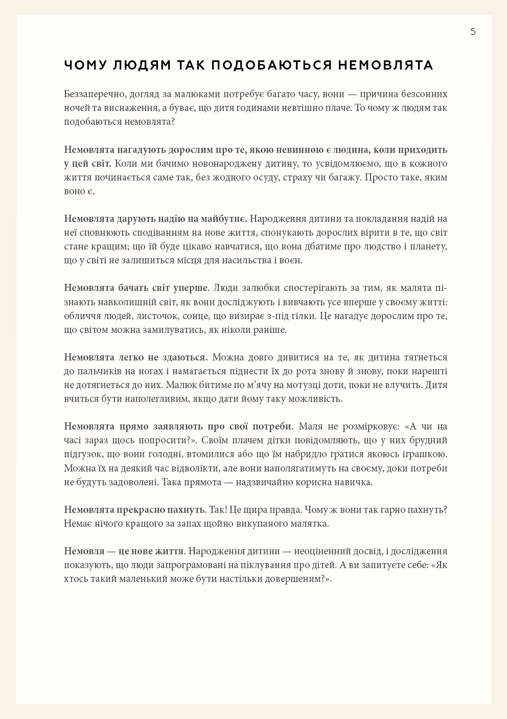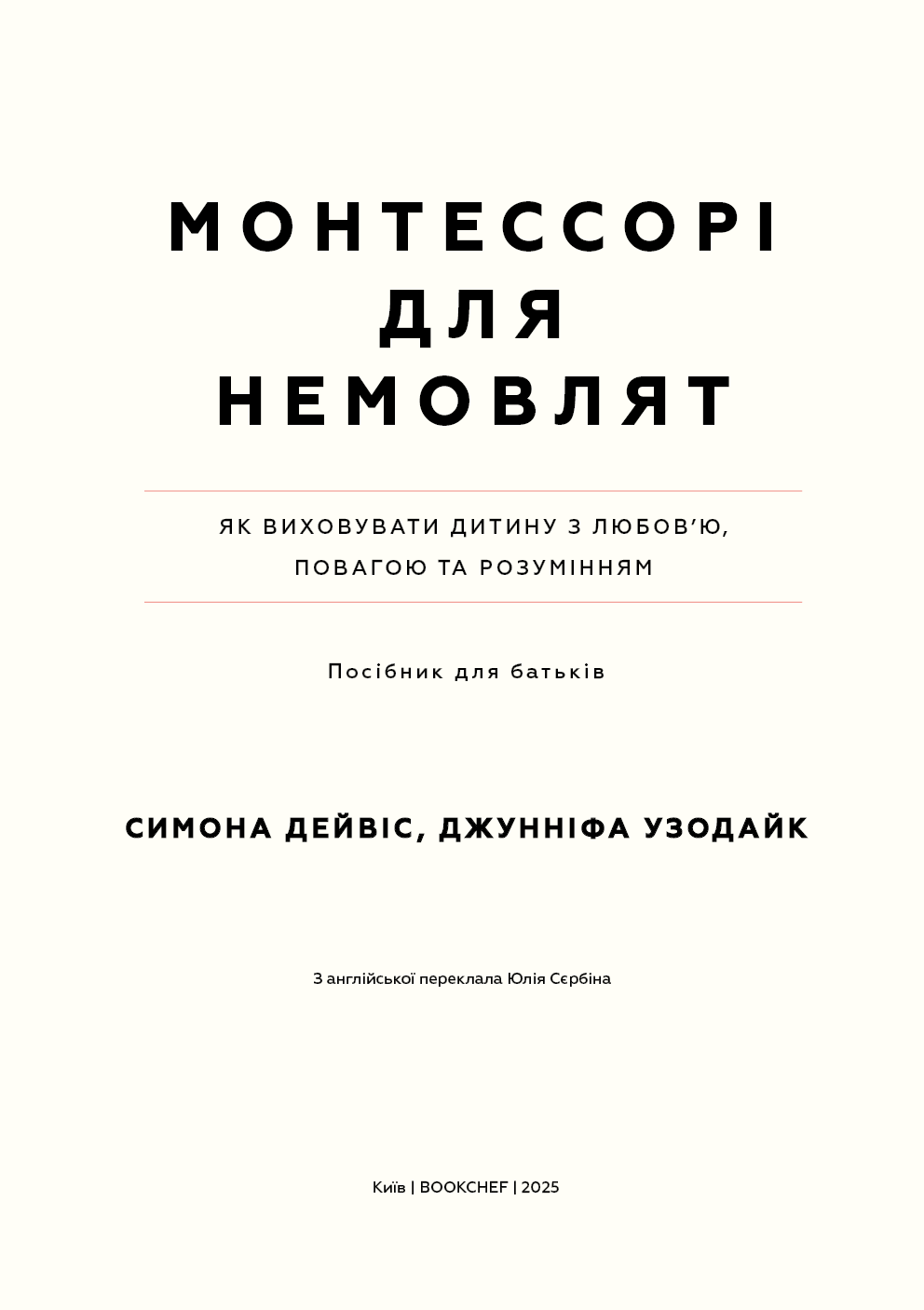 Колись немовлят вважали тендітними, пасивними істотами, здатними лише їсти, спати й плакати, тож найкраще, що могли робити батьки, — це загорнути дитину в теплу ковдру та слідкувати, щоб вона була чистою і ситою. А потім з’ясувалося, що діти з моменту народження прагнуть сприймати доступну їм інформацію про навколишній світ, тож завдання батьків — створити всі умови для того, аби дитина вже в перші місяці свого життя могла задовольняти свої пізнавальні потреби. Симона Дейвіс, авторка бестселера «Монтессорі для малюків», пропонує дозволити дитині керувати процесом пізнання. Спочатку варто поспостерігати за дитиною, а не кидалися керувати нею, потім — відмовитися від нав’язаних маркетингом іграшок і замість цього забезпечити простий, красивий простір для її розвитку. Однак найважливіше — зрозуміти, що кожна дитина — унікальна і що наша роль — бути провідником, який допоможе їй вирости в найкращу версію себе без тиску з нашого боку. Усього цього авторка навчає молодих батьків, педагогів і вихователів у книзі «Монтессорі для немовлят».