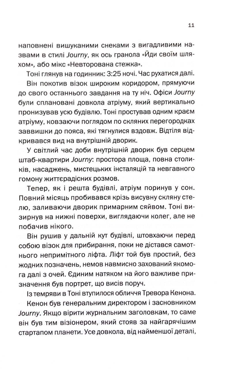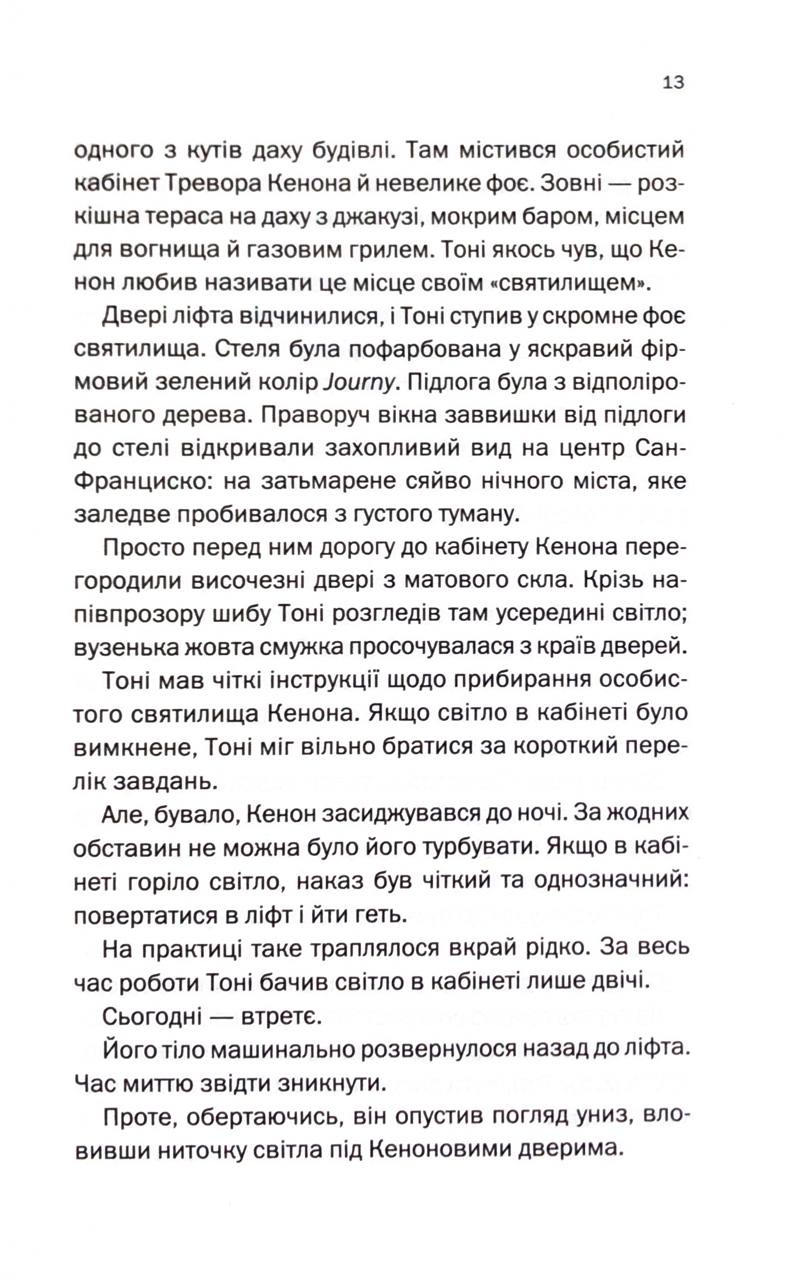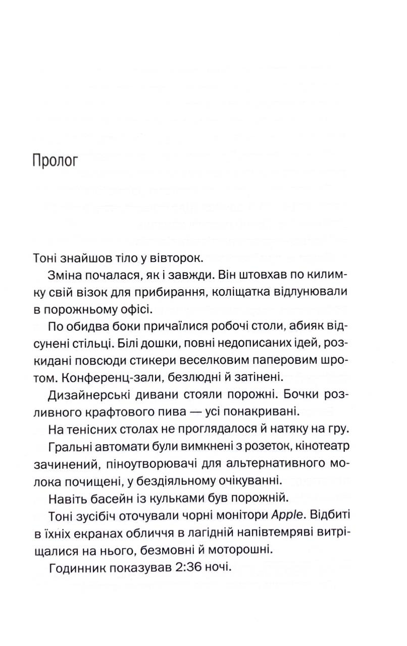 Чудовий дебют, що спершу здається традиційним детективом, але насправді виявляє себе як історія з багатьма несподіванками. Керр використовує глибоке розуміння Кремнієвої долини, щоб висміяти марнославство й ілюзії технологічних еліт і поставити під сумнів кордони моралі в сучасному світі великих грошей і впливу.