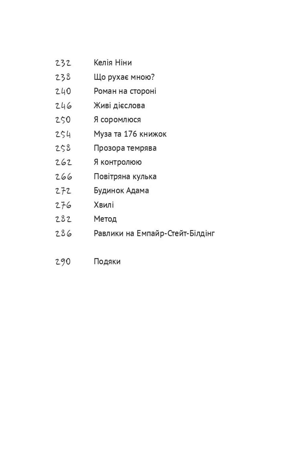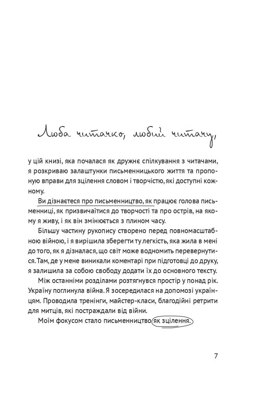 У виданні поєднані особисті історії з письменницького життя, вправи для терапевтичного та творчого письма, уважність до тіла, ритму й настрою. Вона підтримує творчий потік, коли натхнення зникає, і делікатно супроводжує, коли власний голос тільки-но з’являється.