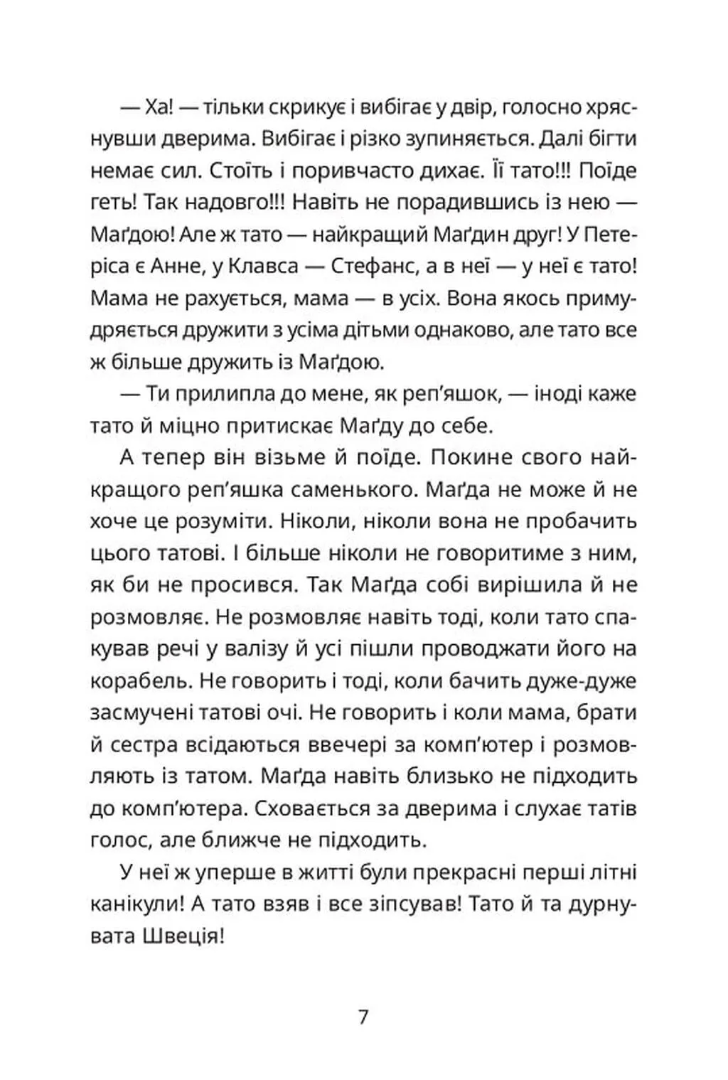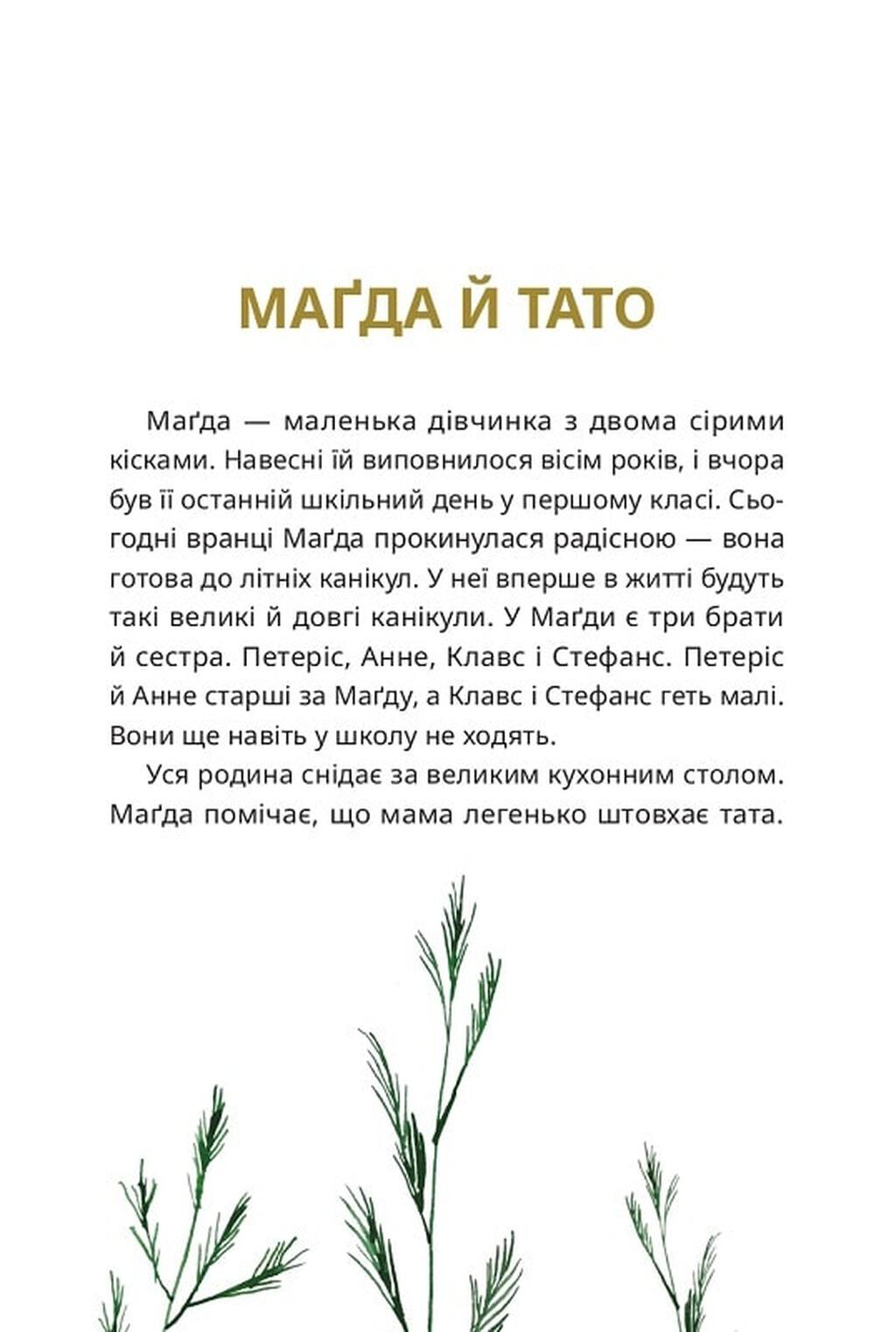 Маґда — маленька дівчинка з двома сірими кісками. Навесні їй виповнилося вісім років, і вчора був її останній шкільний день у першому класі. Вона з нетерпінням чекає канікул, які мріяла провести з братами, сестрами й, найголовніше, з татом.