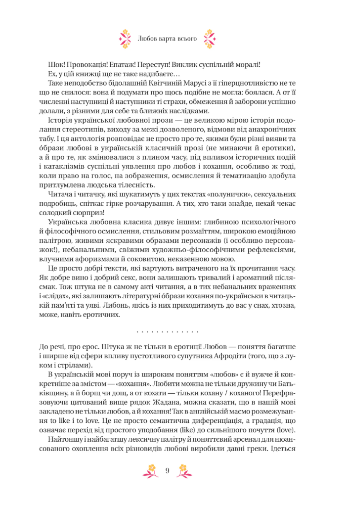 Українська любовна класика захоплює глибиною психологічного й філософського осмислення, стильовим розмаїттям, широкою емоційною палітрою, яскравими образами персонажів і персонажок, свіжими рефлексіями, влучними афоризмами та соковитою мовою.