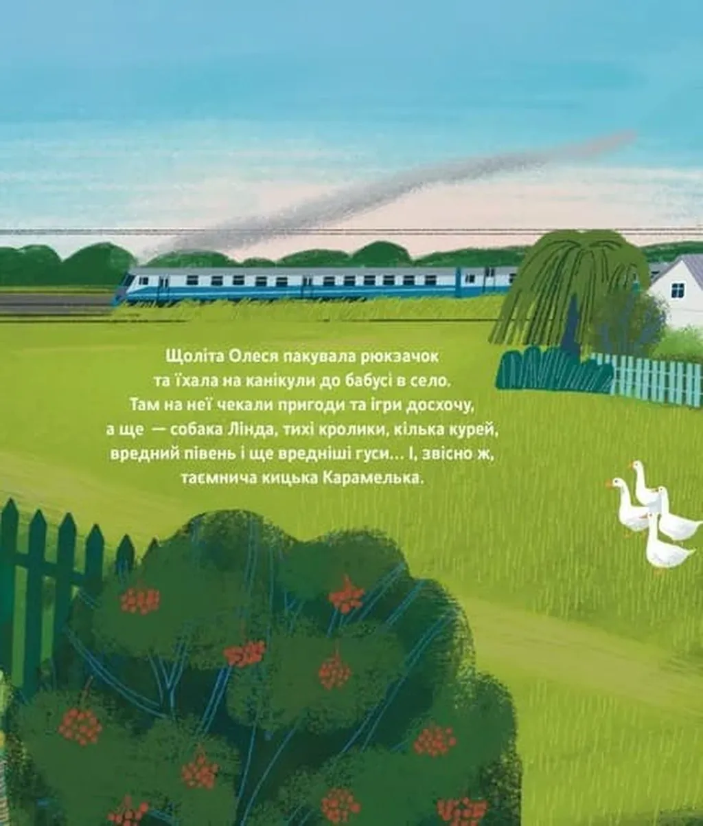 Ця історія — про допитливу дівчинку, таємничу кішку і справжню дружбу. Олеся обожнює проводити літо в бабусі в селі, адже навколо стільки всього цікавого: кролики, гуси, кури й навіть вреднючий півень, який завжди має свою думку.