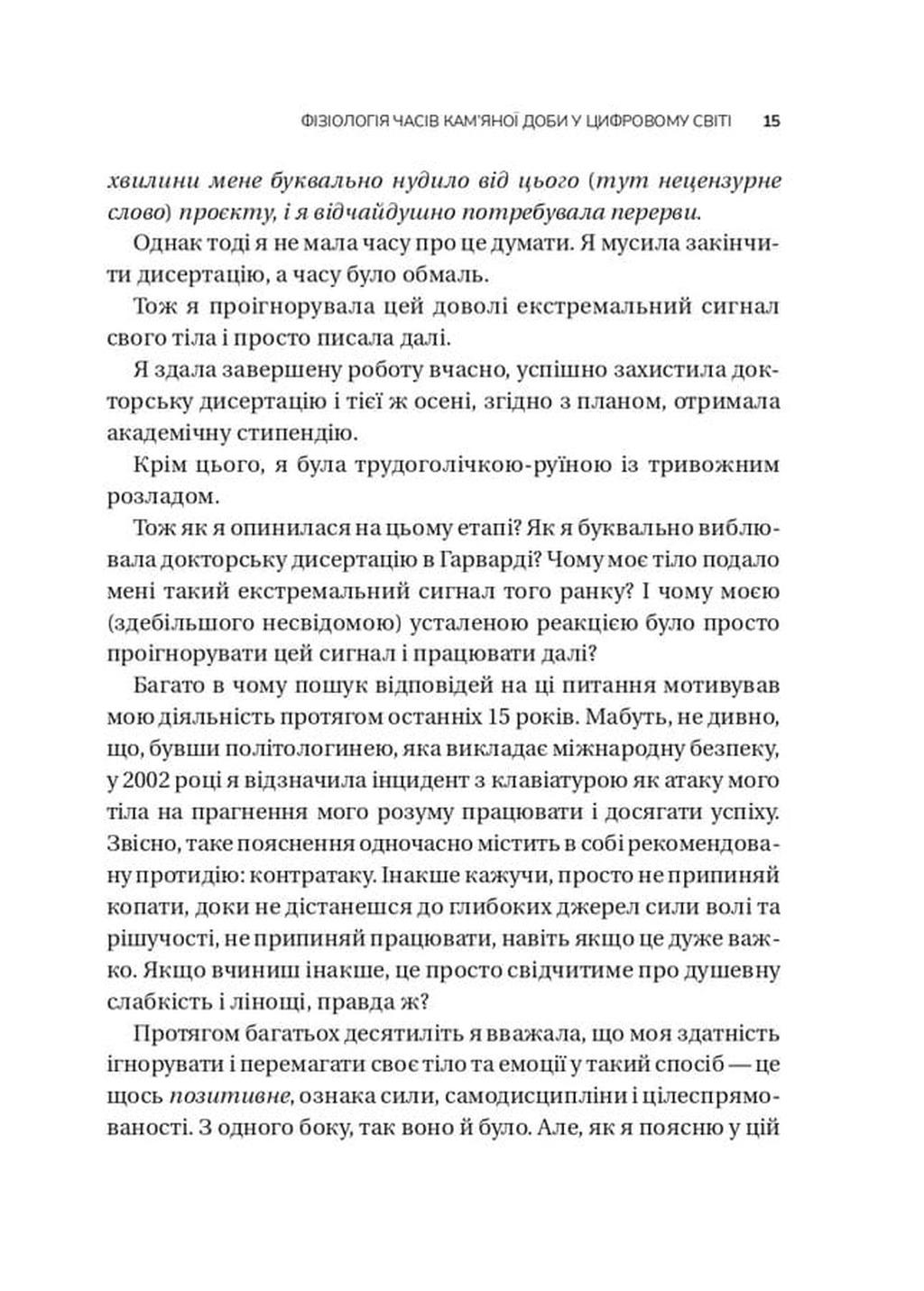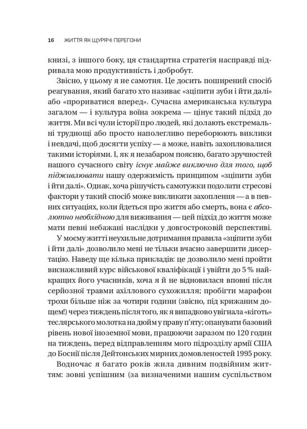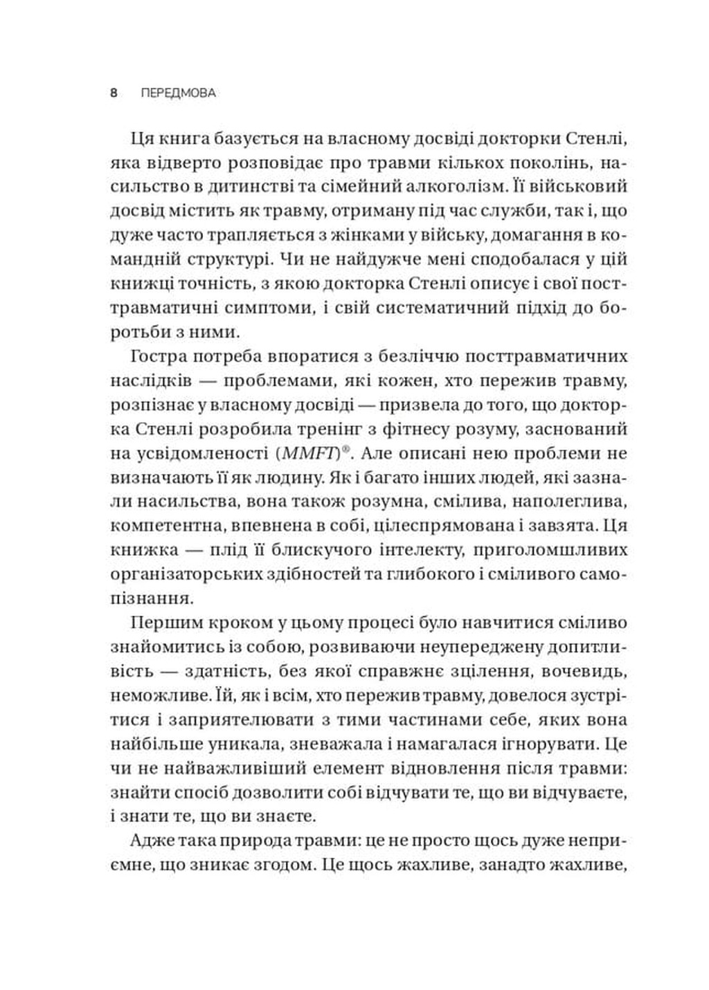 Авторка аналізує культурні й соціальні норми, що заважають відновленню, та пропонує комплексний підхід до зцілення після травм. В основі книги — авторська програма тренування життєстійкості Mindfulness-based Mind Fitness Training (MMFT), яка поєднує наукові дослідження, практики усвідомленості та тілесної регуляції.