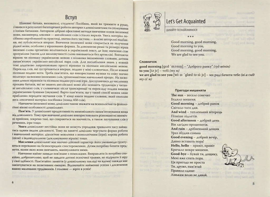 Посібник пропонує нестандартні прийоми навчання англійської мови дошкільнят.Відповідно до вікових особливостей дітей дібрано тематику спілкування, лексичні одиниці, комунікативні ситуації. Вірші, пісеньки, ігри сприятимуть швидкому запам’ятовуванню англійських слів, виразів та цілих речень. Розвивальні ігри, подані у посібнику, допоможуть узагальнити і закріпити знання, вміння та навички дошкільнят та учнів початкових класів.Для батьків, учителів англійської мови в дошкільних закладах та загальноосвітніх школах, студентів.