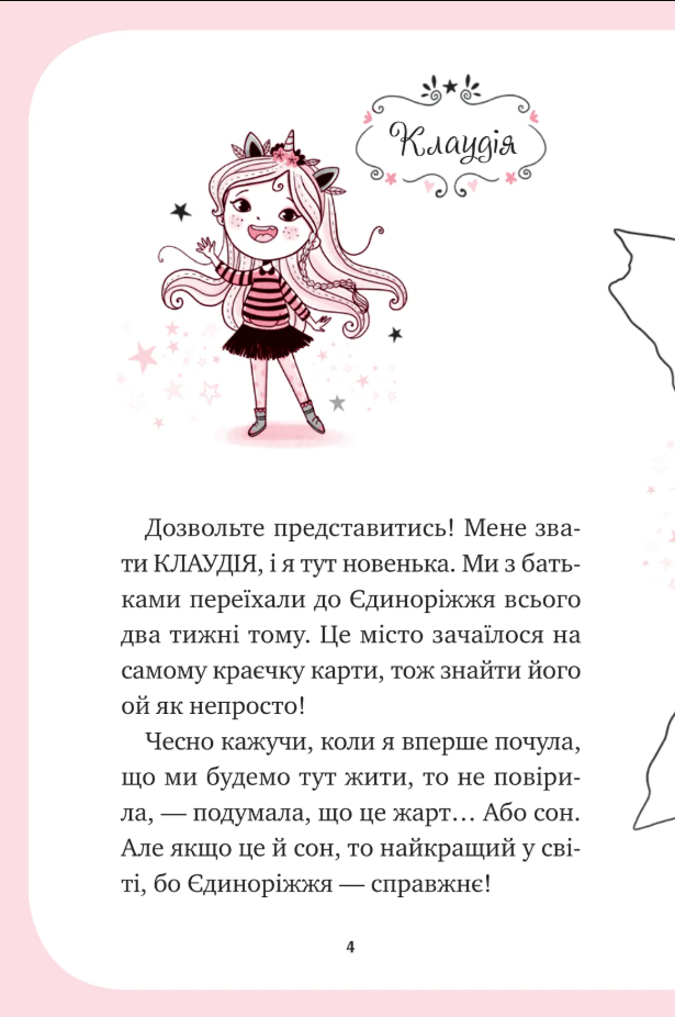 Книга розповідає про перші кроки Клаудії у фантастичному світі Єдиноріжжя — країні, де єдинороги не лише існують, а й дозволяють людям літати верхи на них. Навчання у магічній школі відкриває перед героїнею нові можливості, але водночас ставить перед нею непрості завдання, які потребують сміливості, наполегливості та віри в себе.