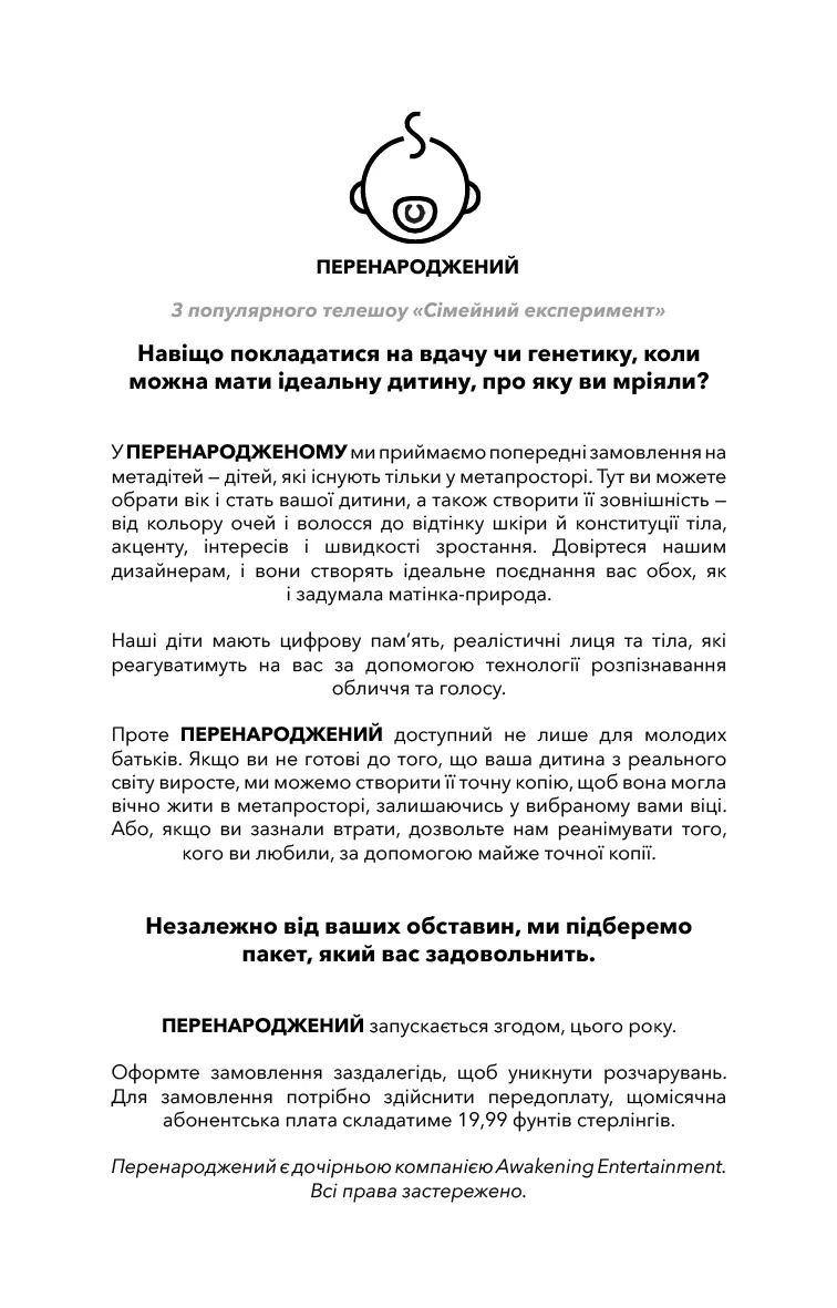Головний приз — складний моральний вибір: залишити метадитину або відмовитися від неї заради можливості мати справжнього малюка. Але що насправді означає бути батьками — у цифровому чи реальному світі?