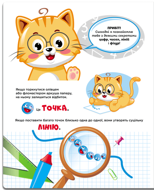 - знайомить із базовими математичними поняттями: точка, лінія, відрізок, кут, форма, розмір, напрямок, відстань, фігура, цифра;