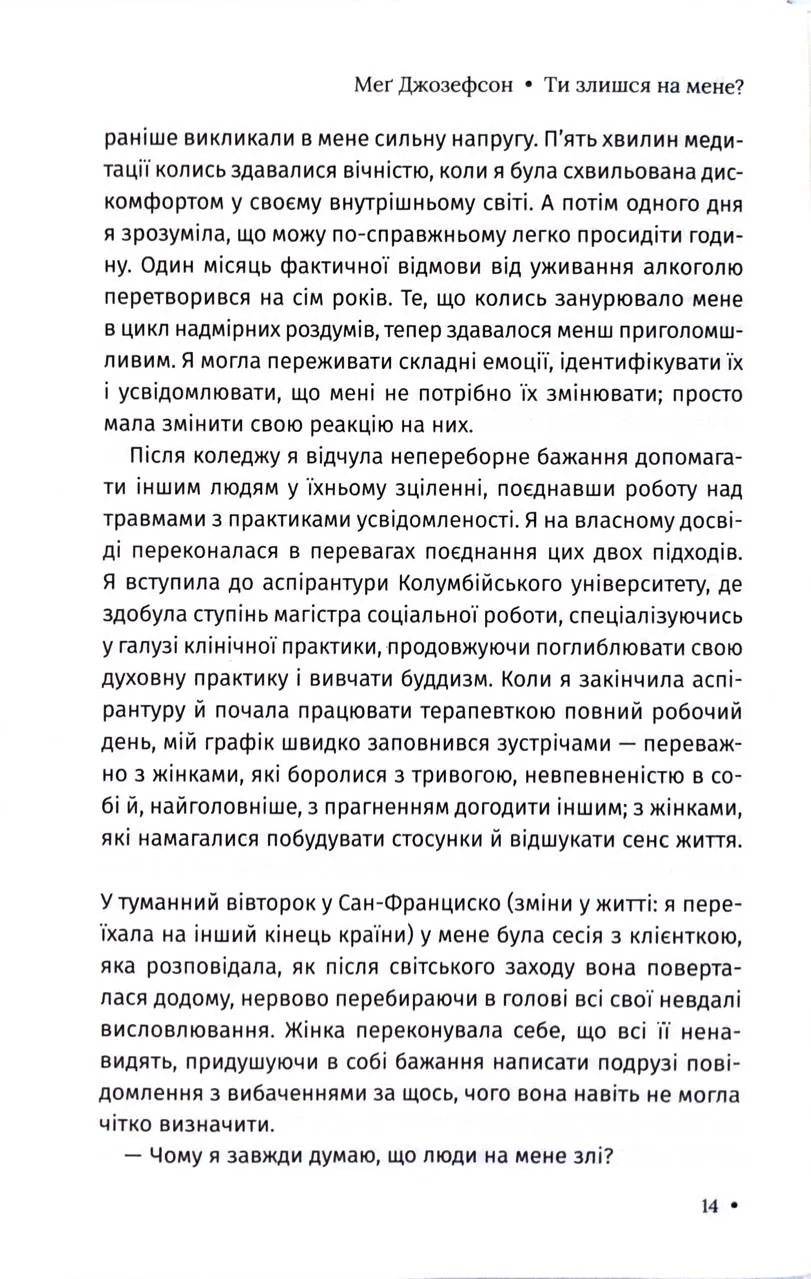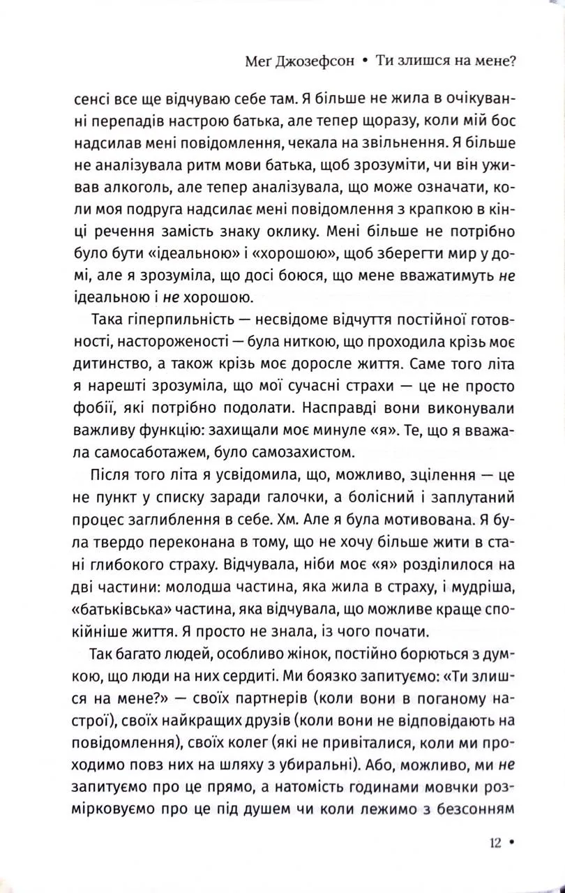 Книга Ти злишся на мене? Як позбутися залежності від чужої думки та почати жити власним життям авторства Меґ Джозефсон — це практичний посібник для тих, хто втомився бути «зручним» для всіх навколо. Психотерапевтка Меґ Джозефсон допомагає розібратися, чому ми так боїмося розчарувати інших і як нарешті почути власний голос у гаморі чужих очікувань.