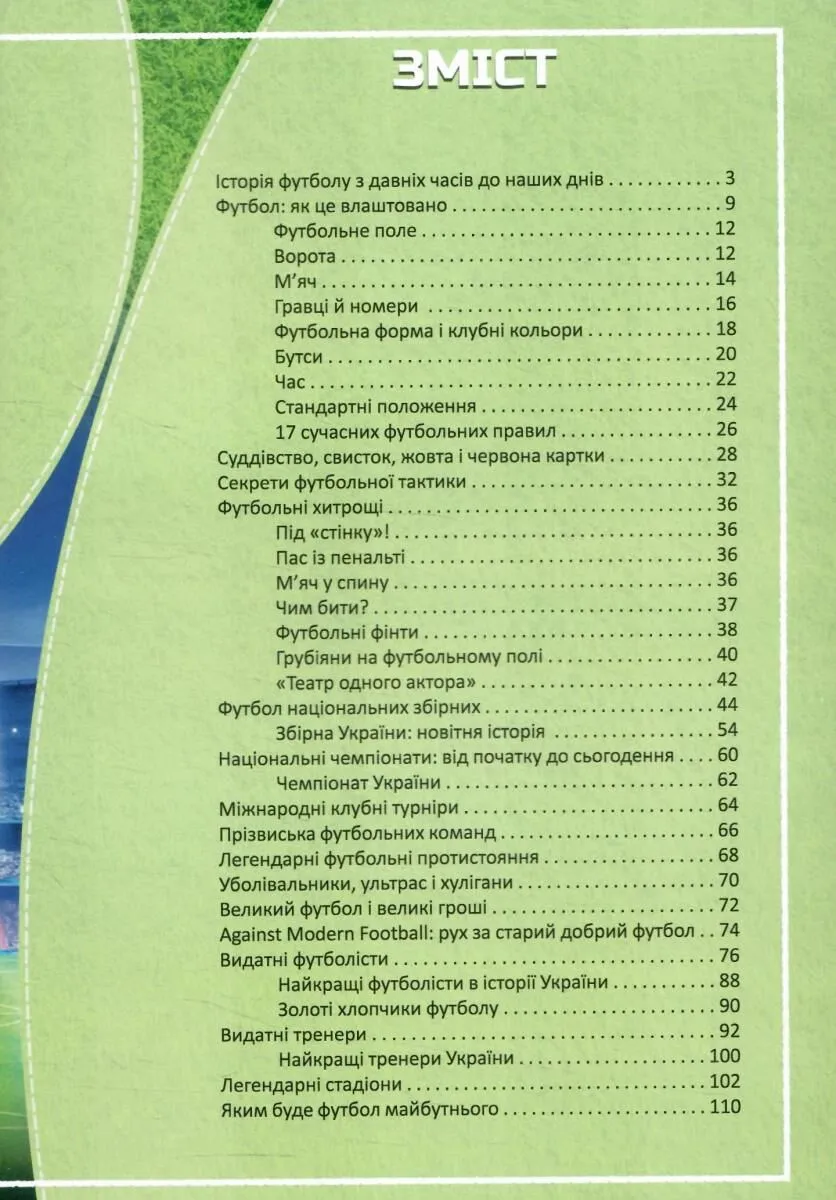 Ця книжка — зручний путівник у неосяжному і складному світі сучасного футболу. Тут читач знайде цікаві відомості про історію гри з м'ячем від її витоків до технологічно досконалої сучасності. Видання детально розповідає про правила гри, її еволюцію, особливості тактичних побудов та технічні прийоми, які використовують найкращі майстри світу.